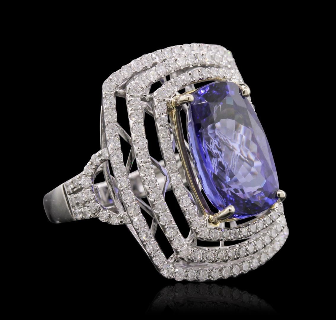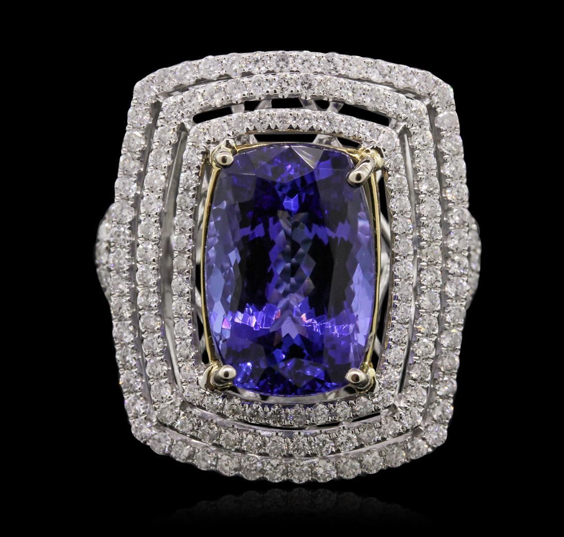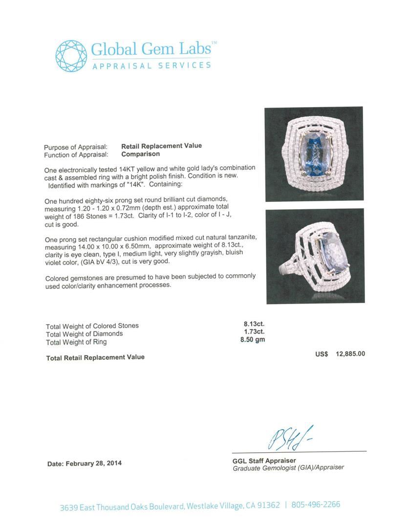 One electronically tested 14KT yellow and white gold Ladies combination cast & assembled ring with a bright polish finish. Condition is new. Identified with markings of "14K". Containing: One Hundred Eighty-Six prong set round brilliant cut diamonds, measuring 1.20 - 1.20 x 0.72mm (depth est.) approximate. Total Weight of 186 Stones = 1.73ct. Clarity: I-1 to I-2. Color: I - J, Cut is Good. One prong set rectangular cushion modified mixed cut natural tanzanite, measuring 14.00 x 10.00 x 6.50mm, approximate weight of 8.13ct., clarity is eye clean, type I, medium light, very slightly grayish, bluish violet color, (GIA bV 4/3), cut is very good. Colored gemstones are presumed to have been subjected to commonly used color/clarity enhancement processes. Total Weight of Colored Stones 8.13ct. Total Weight of Diamonds 1.73ct. Total Weight of Ring 8.50 grams. GGL Appraised.