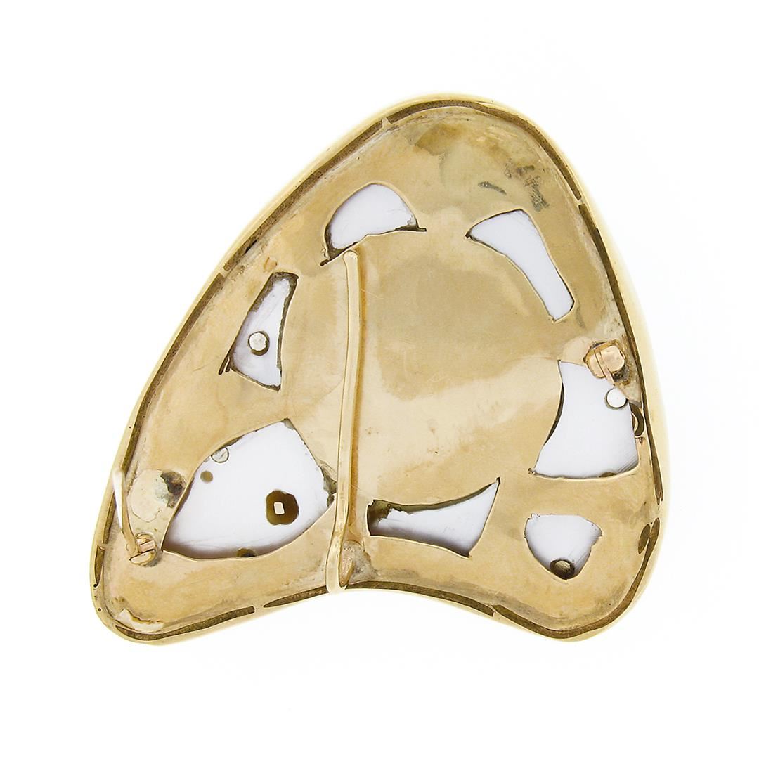 A solid 14k yellow gold brooch pendant, featuring 12 multi shapes natural diamonds (G/K - VS2/I2 ; 1.37ctw), and old marquise cut natural ruby, aquamarine, moonstone, citrine, emerald, amethyst & garnet, with 1 baroque shape cultured pearl. Measures 53.10x52.10mm and weighs a total of 42.47 grams.