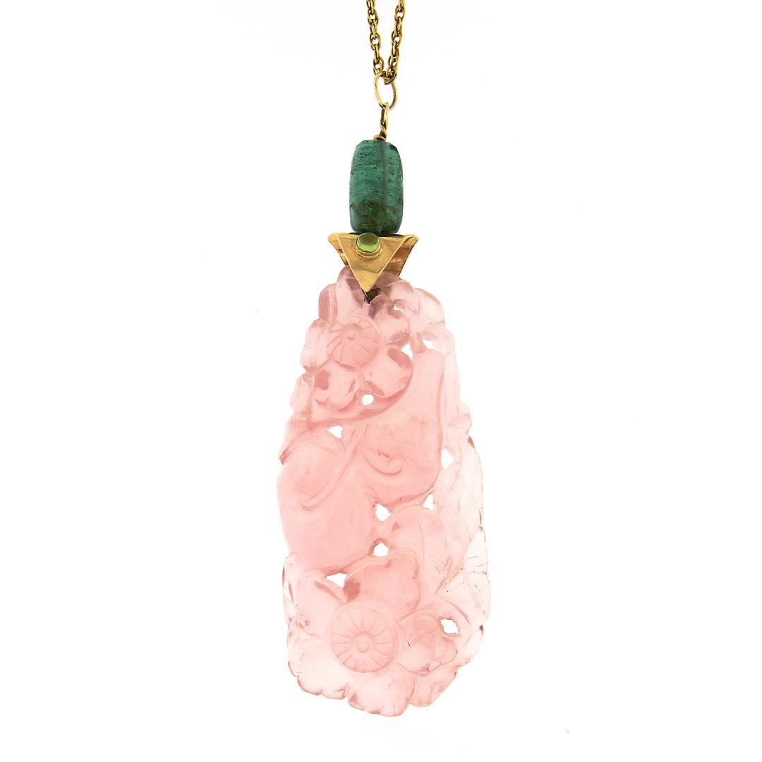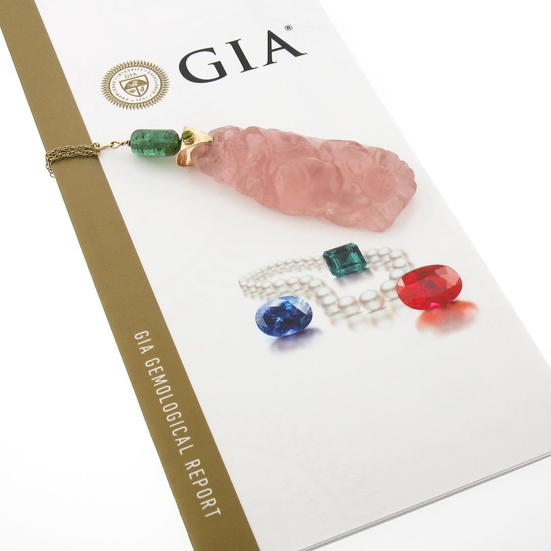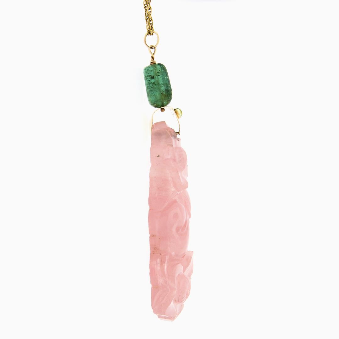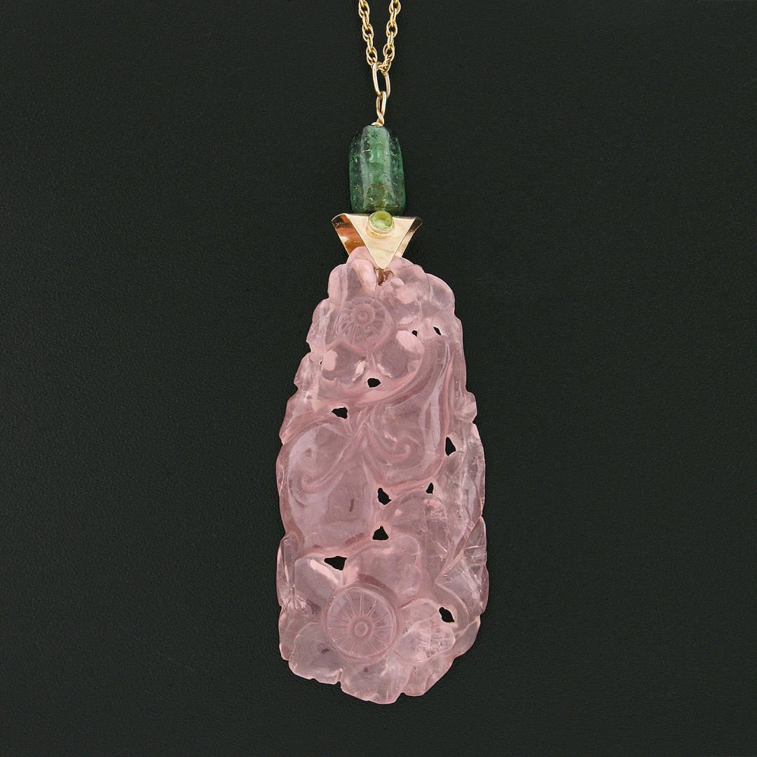 A solid 14k white gold pendant necklace, with 1 GIA graded floral carved natural rose quartz (60.33x 27.70x10.58 mm), and 1 round cabochon cut natural lemon quartz (3.1mm ), and 1 elongated bead shape natural green tourmaline (13x7.5mm). 22 inch rope link chain, 28.86 grams total weight, pendant measures 77.7x27.7mm. Comes with all original relevant certifications.