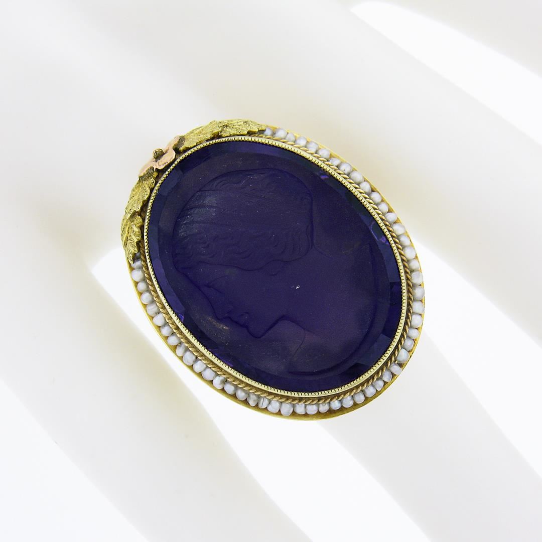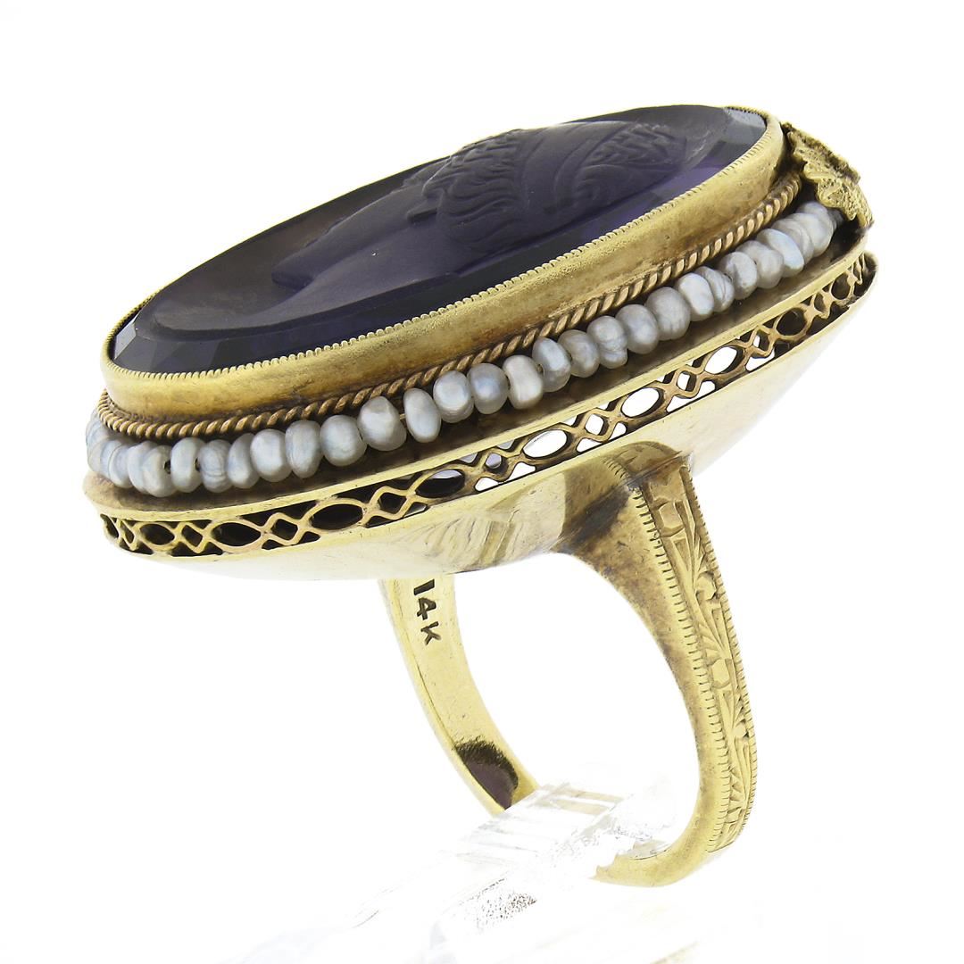 A solid 14k yellow gold floral ring. with 1 carved cameo oval cut natural amethyst ( 20x26.5x9.5mm (approx.) - 26ct ), and a halo of numerous semi round cultured seed pearls. The ring is size 6.0, weighs a total of 14.02 grams, and measures 31.8mm wide.