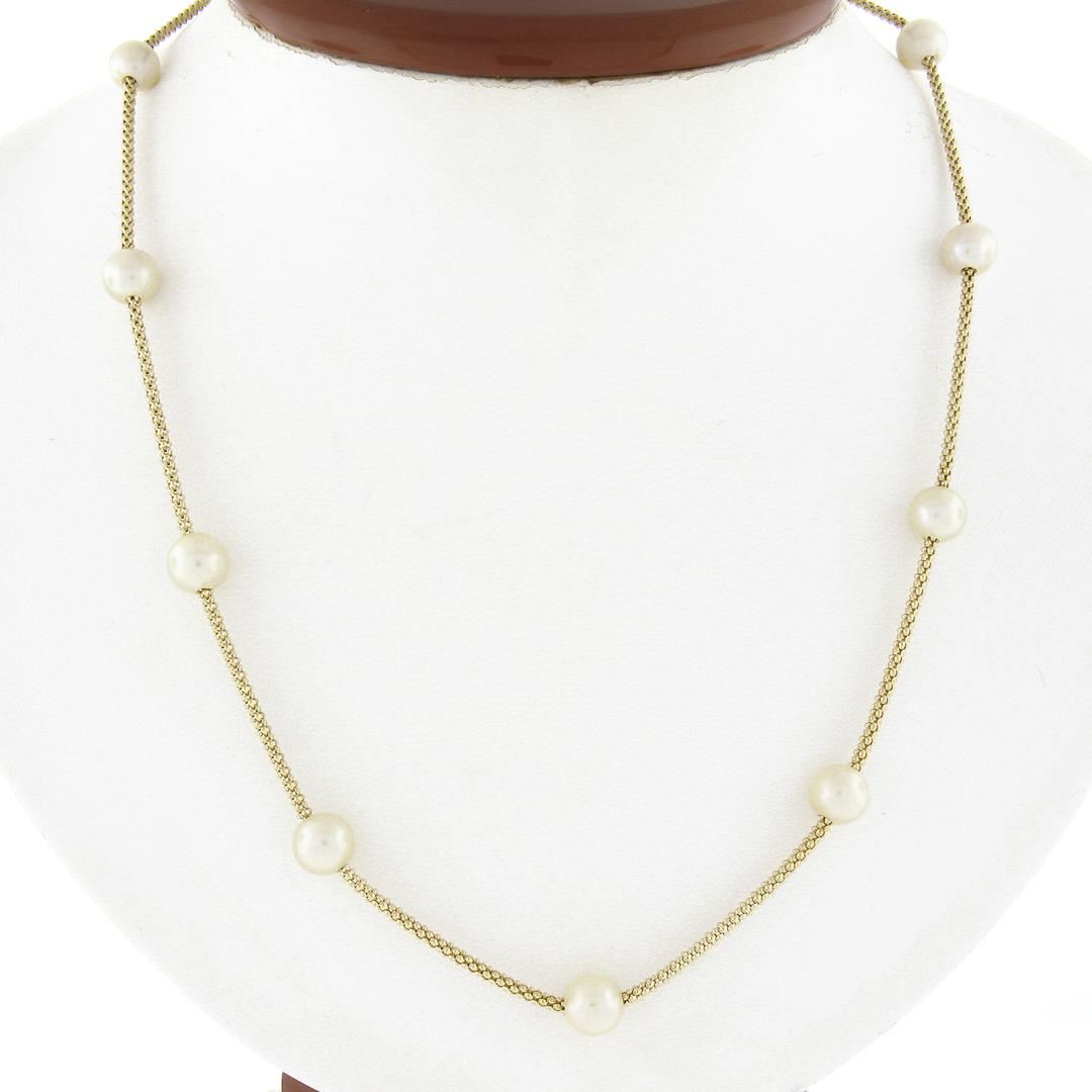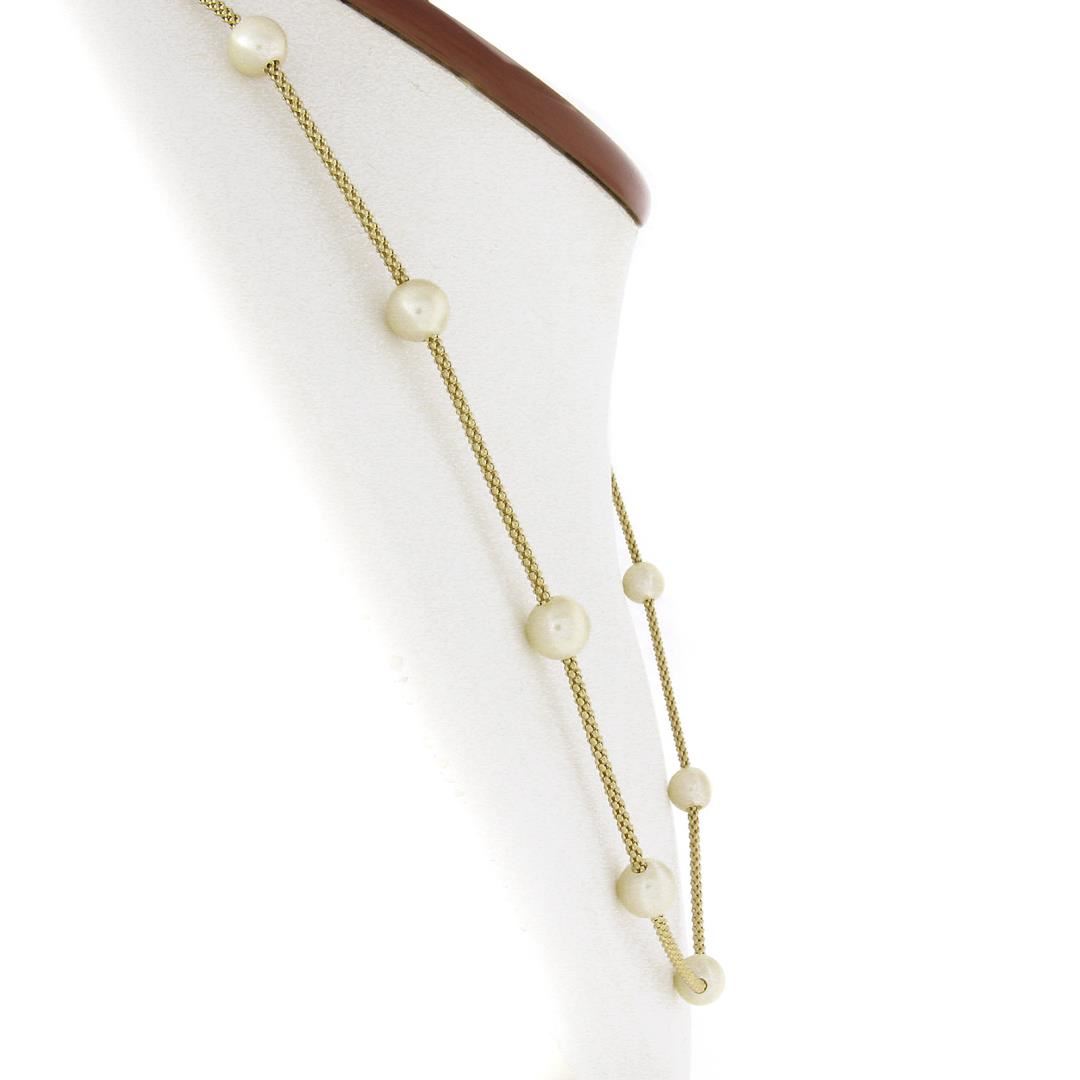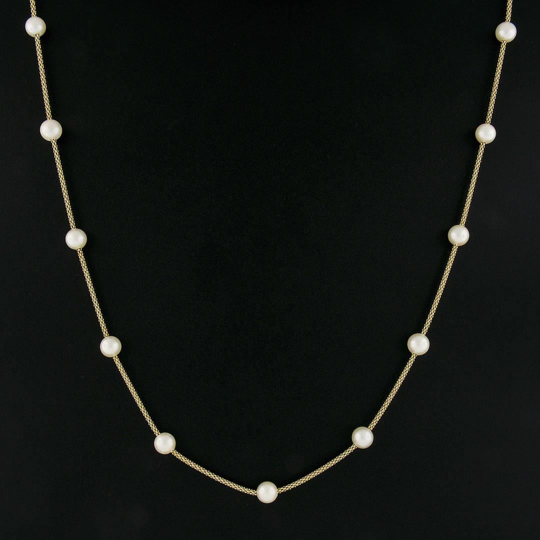 A solid 14k yellow gold by the yard necklace, with 11 round shape cultured pearls (7.1-7.4mm each). It weighs a total of 10.19 grams, measures 7.4mm wide, and measures 24 inches in length.