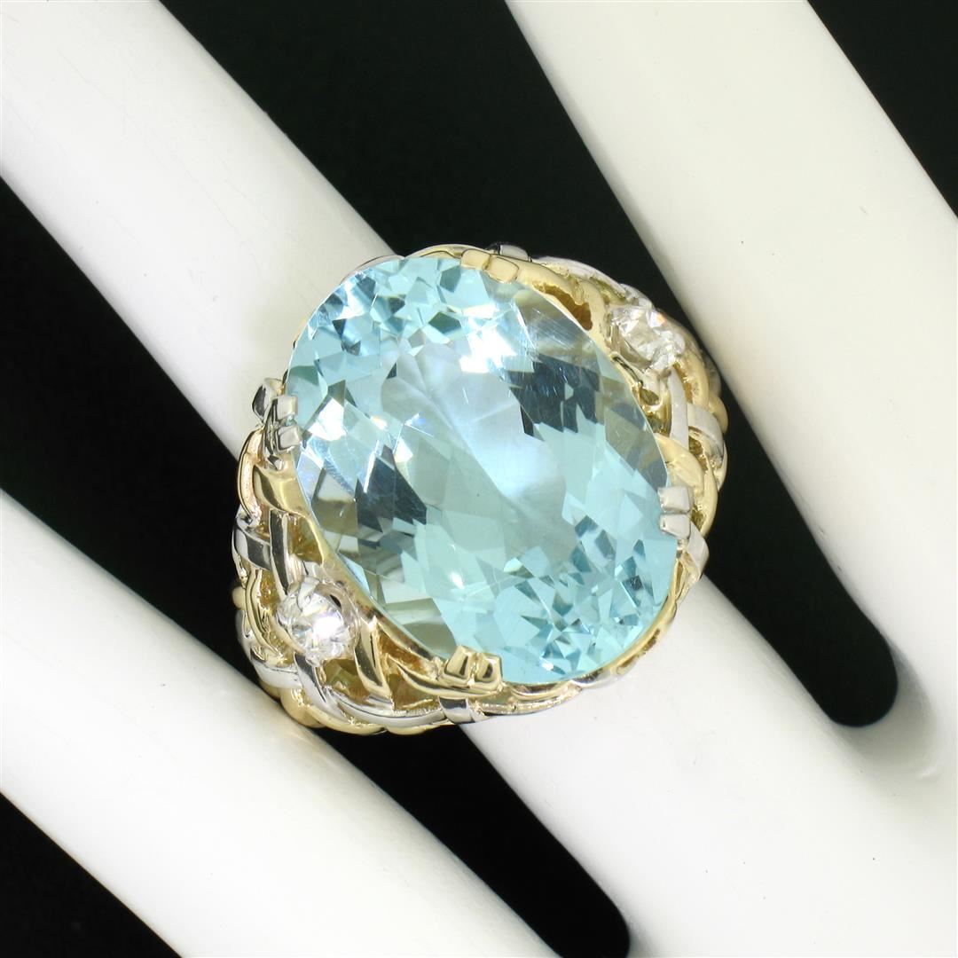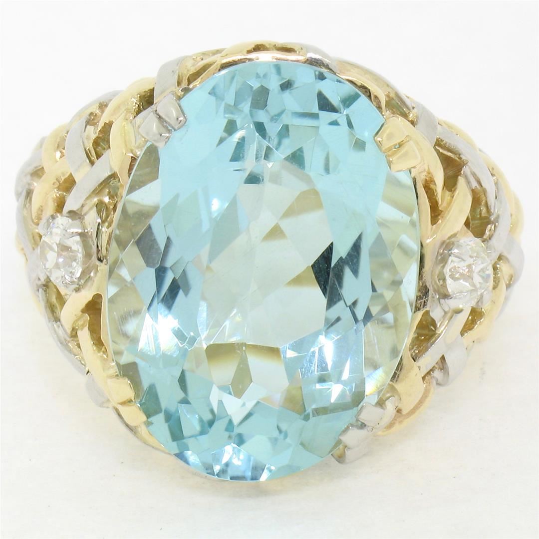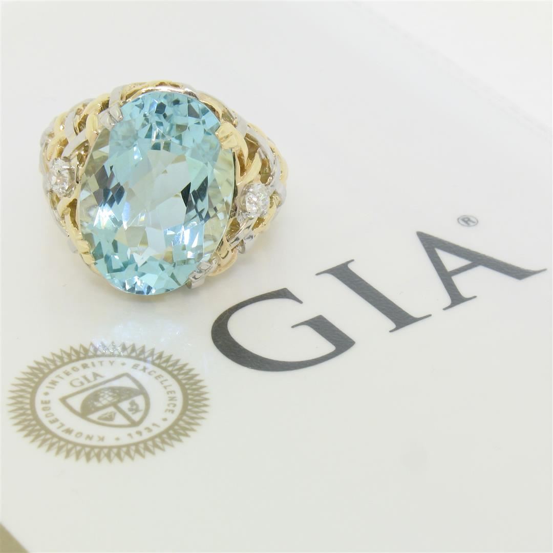 A vintage solid 14k yellow gold and platinum, featuring 1 Gia certified oval cut natural aquamarine (19.13ct), and 2 transitional cut natural diamonds (G/H - VS1/VS2 ; 0.36ctw). The ring is size 10, weighs a total of 18.01 grams, and measures 22.40mm wide. Comes with all original relevant certifications.