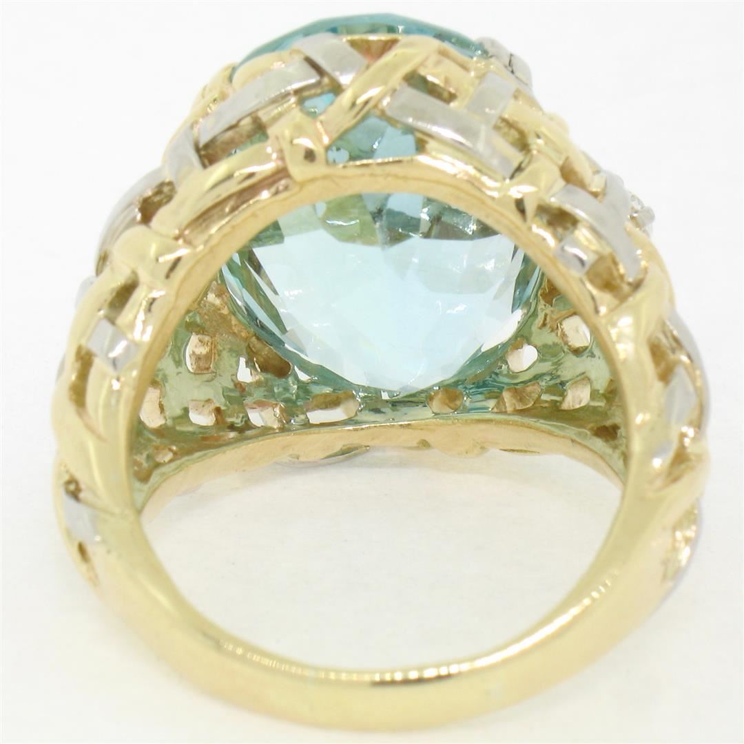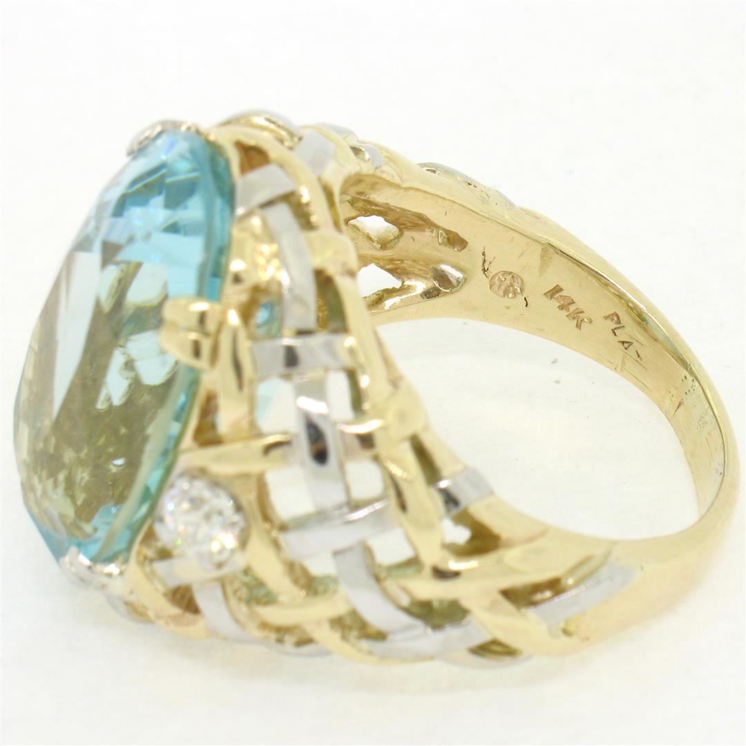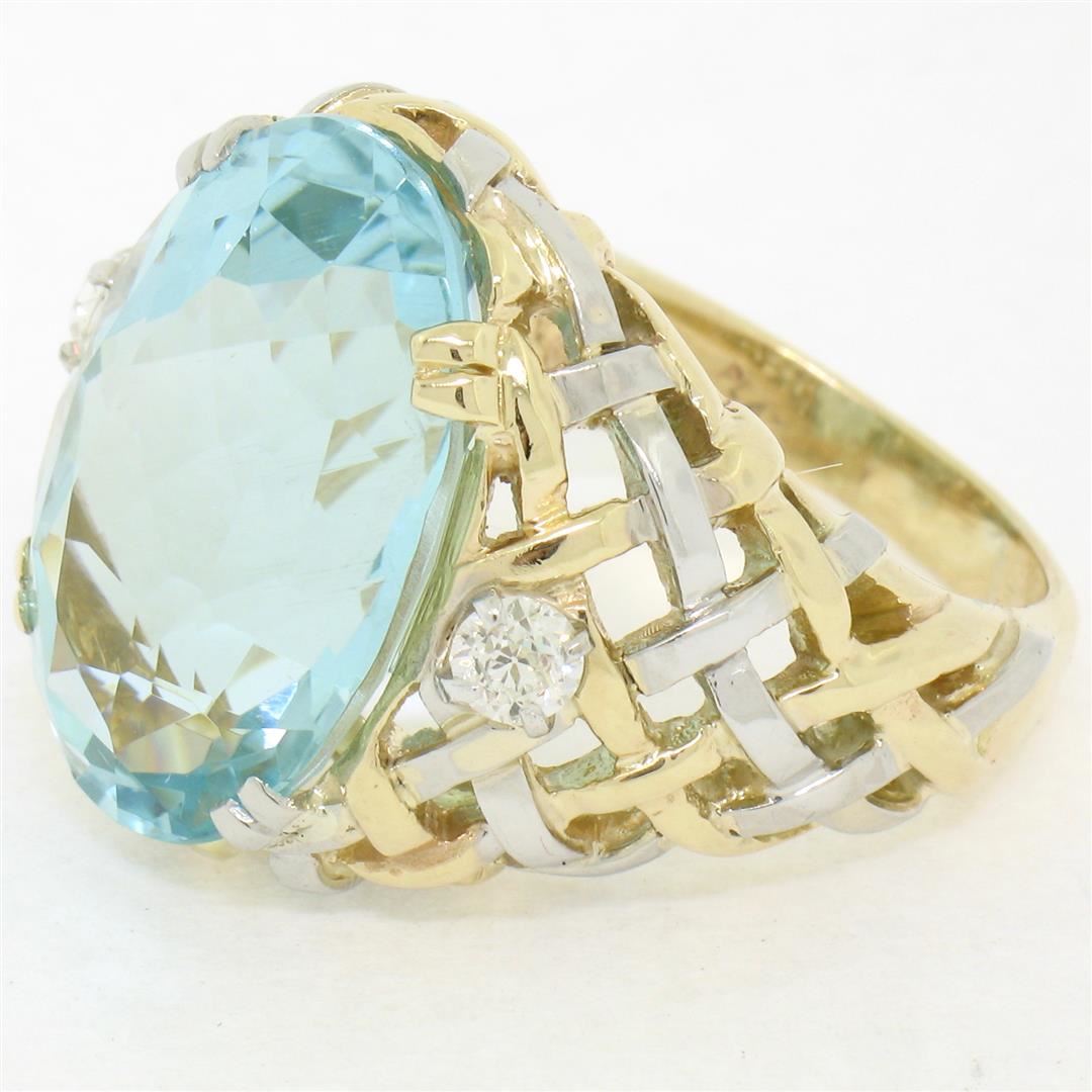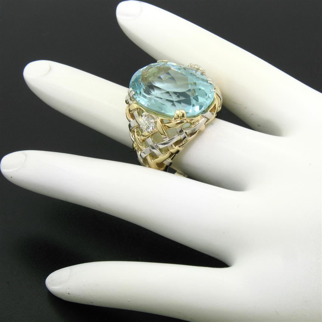 A vintage solid 14k yellow gold and platinum, featuring 1 Gia certified oval cut natural aquamarine (19.13ct), and 2 transitional cut natural diamonds (G/H - VS1/VS2 ; 0.36ctw). The ring is size 10, weighs a total of 18.01 grams, and measures 22.40mm wide. Comes with all original relevant certifications.