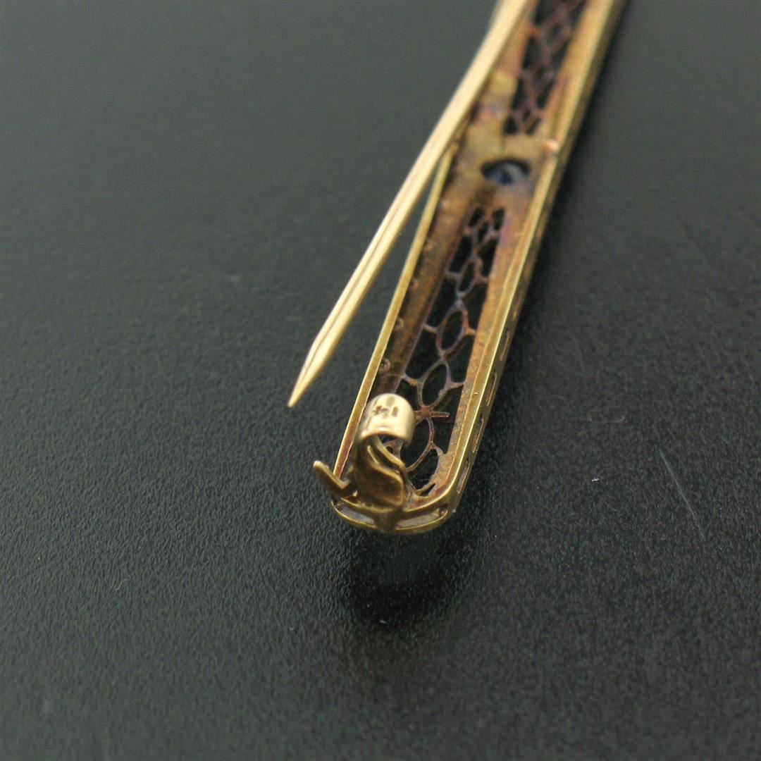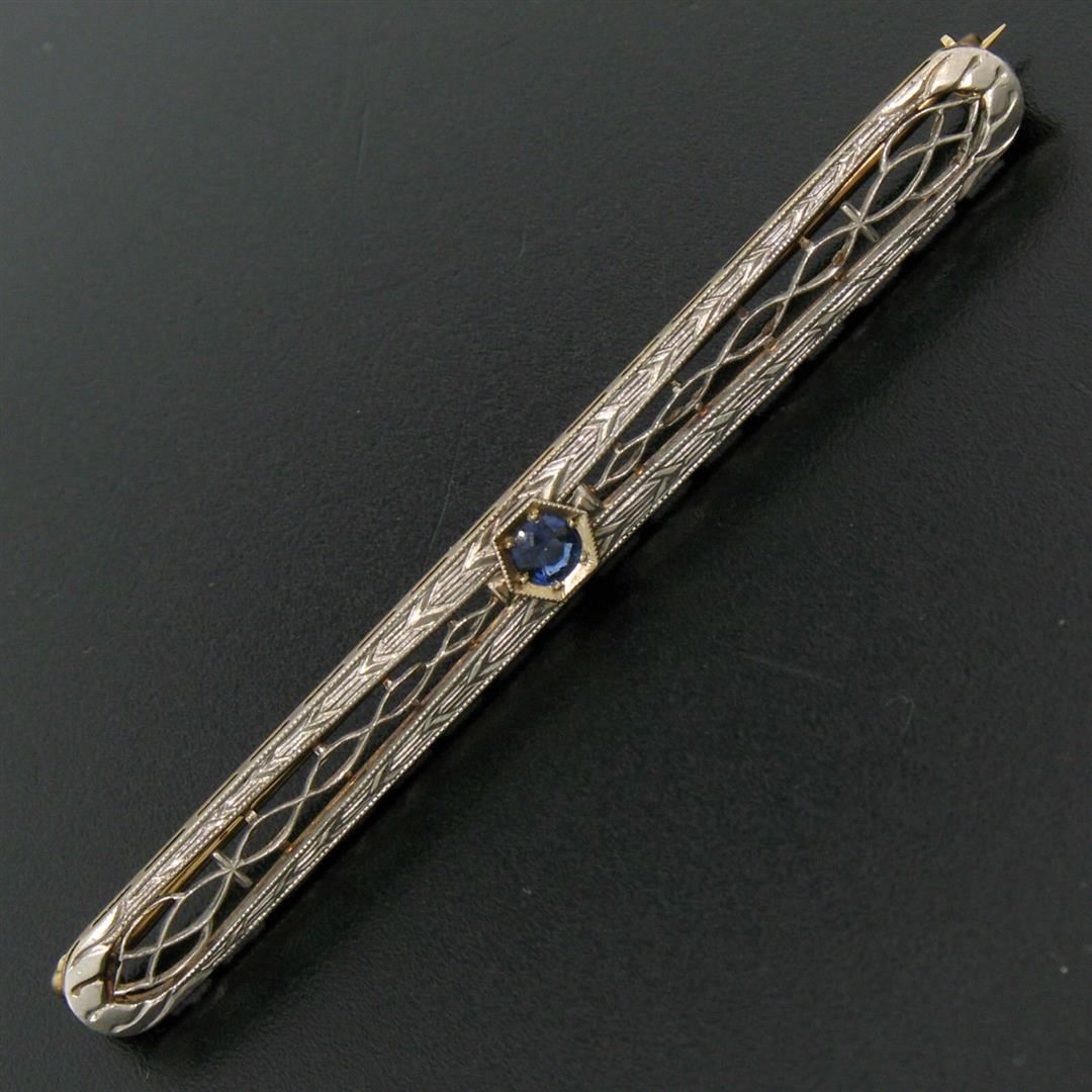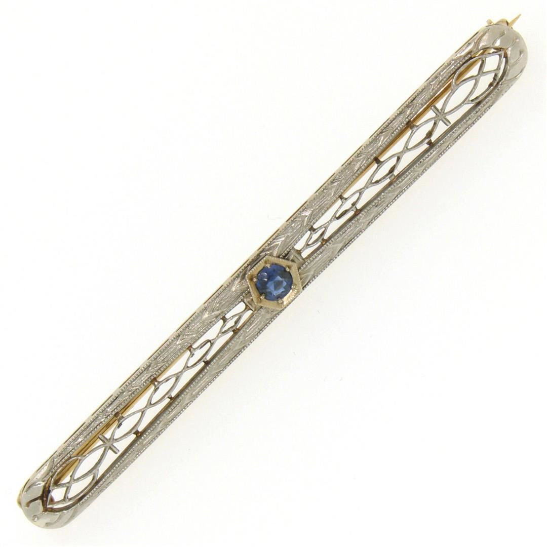 One Antique Art Deco 14k YG & Platinum 0.20ct Round Natural Sapphire Filigree Open Work Bar Pin Brooch. Item Details: Material: 14k Yellow Gold w/ .900 Platinum Top, Total Weight: 4.4 Grams, Stone(s): (1) Natural Genuine Sapphire - Old Round Cut - Bead/Prong Set - Rich Royal Blue Color - 0.20ct (approx.), Overall Height: 6.10mm, Overall Width: 64.76mm, 2.549 inches, Overall Thickness: 3.18mm, Condition: Antique, art deco period piece w/ natural sapphire. Excellent overall condition!