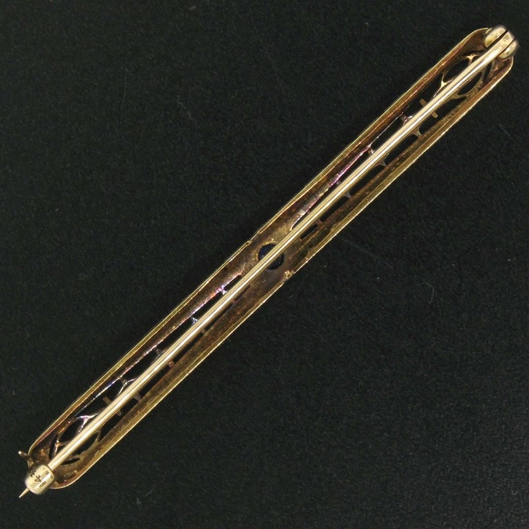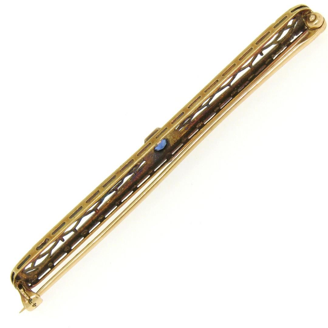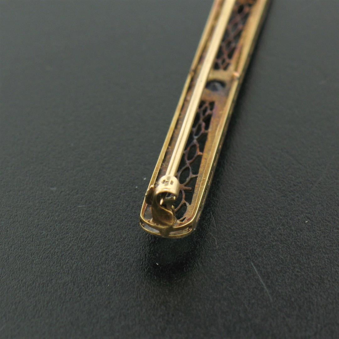 One Antique Art Deco 14k YG & Platinum 0.20ct Round Natural Sapphire Filigree Open Work Bar Pin Brooch. Item Details: Material: 14k Yellow Gold w/ .900 Platinum Top, Total Weight: 4.4 Grams, Stone(s): (1) Natural Genuine Sapphire - Old Round Cut - Bead/Prong Set - Rich Royal Blue Color - 0.20ct (approx.), Overall Height: 6.10mm, Overall Width: 64.76mm, 2.549 inches, Overall Thickness: 3.18mm, Condition: Antique, art deco period piece w/ natural sapphire. Excellent overall condition!