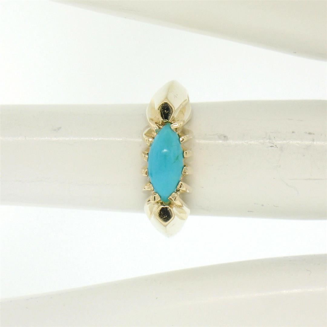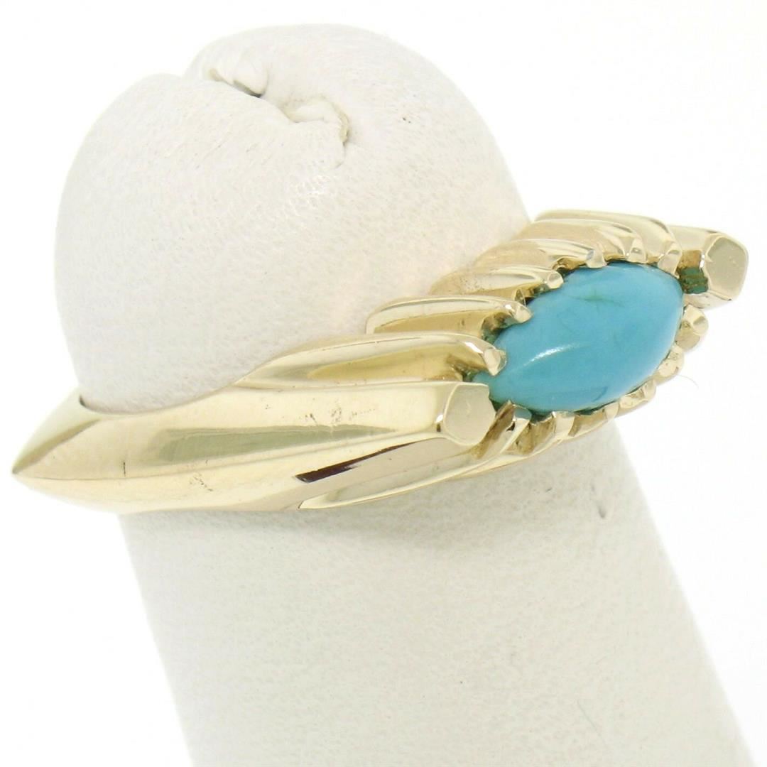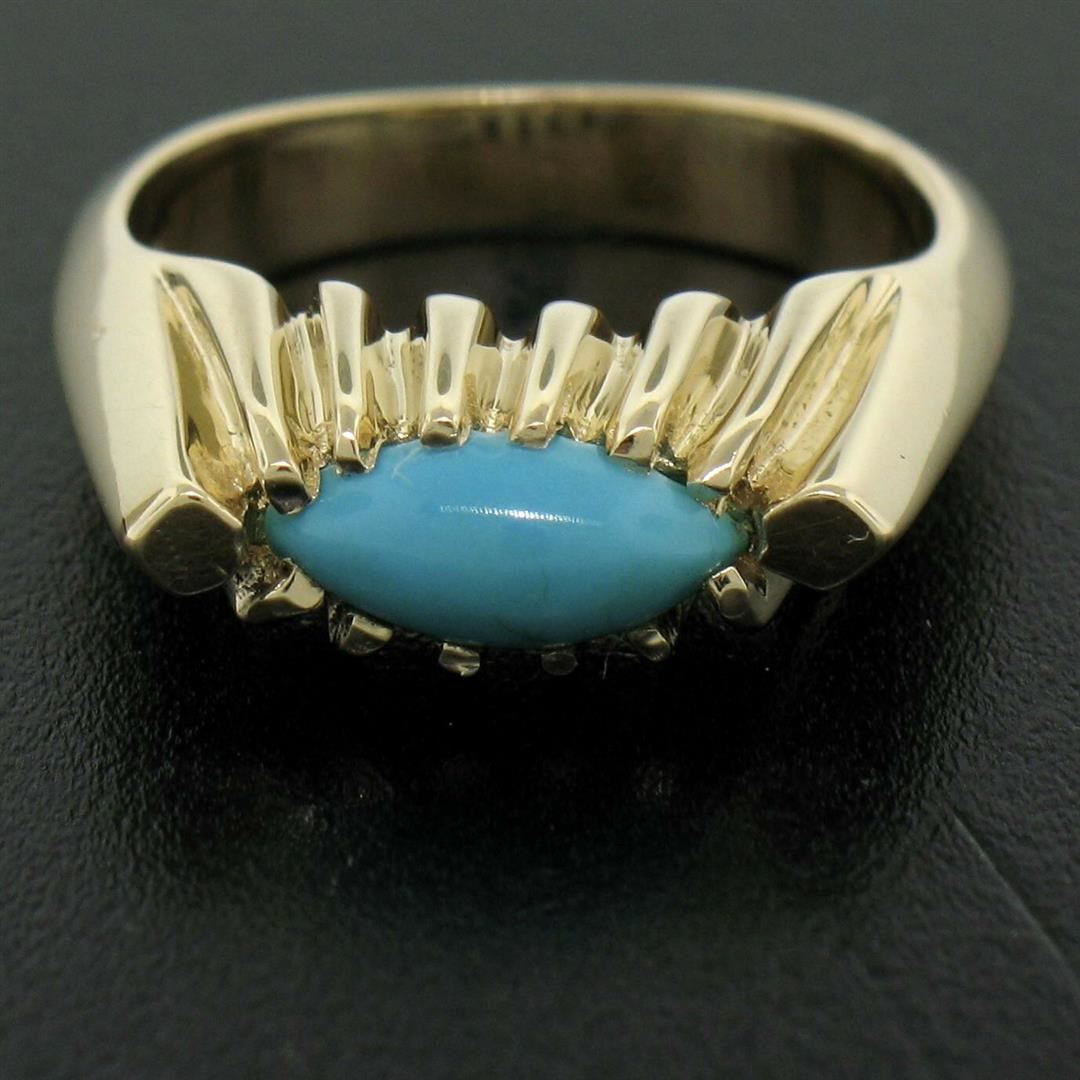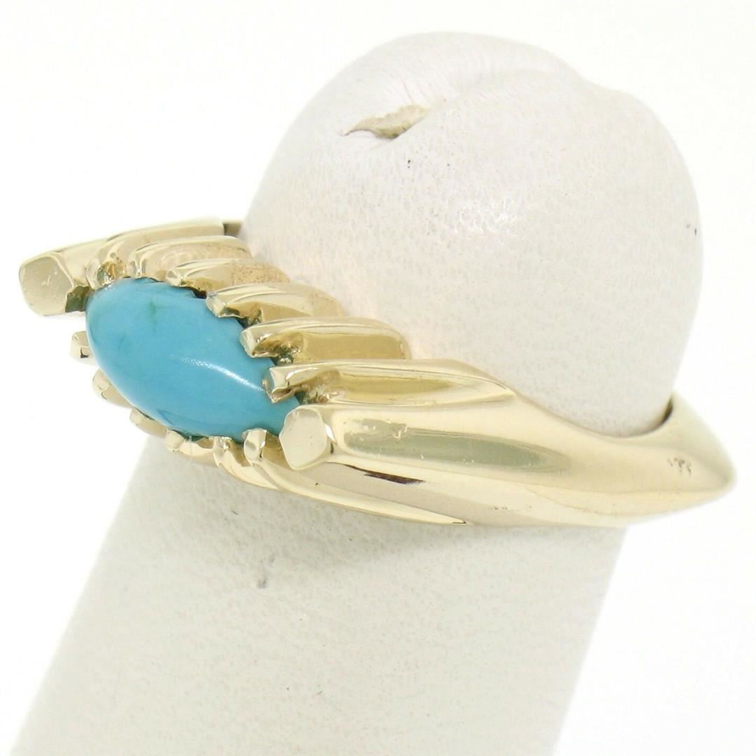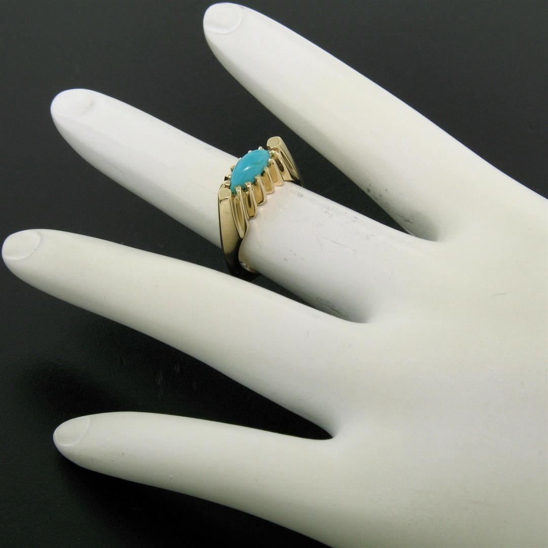 One Vintage 14k Yellow Gold Ribbed Marquise Cabochon Robin Egg Turquoise Solitaire Ring Size 4. Item Details: Material: 14K Solid Yellow Gold, Weight: 5.20 Grams, Stone(s): (1) Natural Genuine Turquoise - Oval Cabochon Cut - Multi-Prong Set - Robin's Egg Blue Color - 8.0x3.5mm / 0.65ct (approx.), Ring Size: 4.0, Ring Width: 5.95mm, Ring Height: 7.06mm rise off the finger, Condition: Vintage Ring. Like New!,