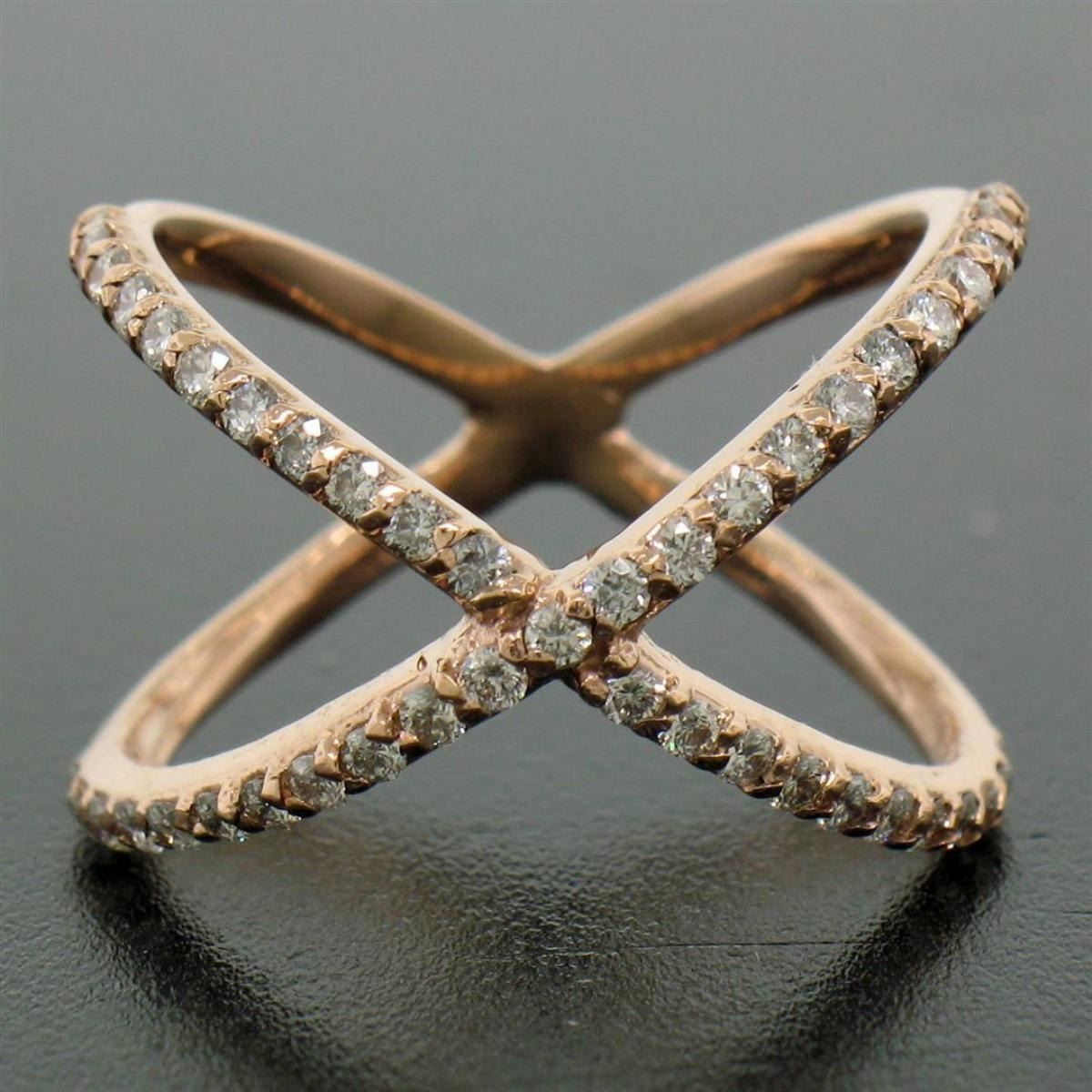 One NEW 14k Rose Gold 0.50ctw 45 Round Brilliant Diamond Simple X Ex Cross Band Ring. Item Details: Material: 14k Solid Rose Gold, Weight: 3.0 Grams, Stone(s): (45) Natural Genuine Diamonds - Round Brilliant Cut - Prong Set - G Color - VS2 Clarity, Total Carat Weight: 0.50, Ring Size: 5.75 (We can custom size this ring.), Ring Width: 13.60mm, Ring Height: 2.50mm rise off the finger, Condition: New w/o Tag