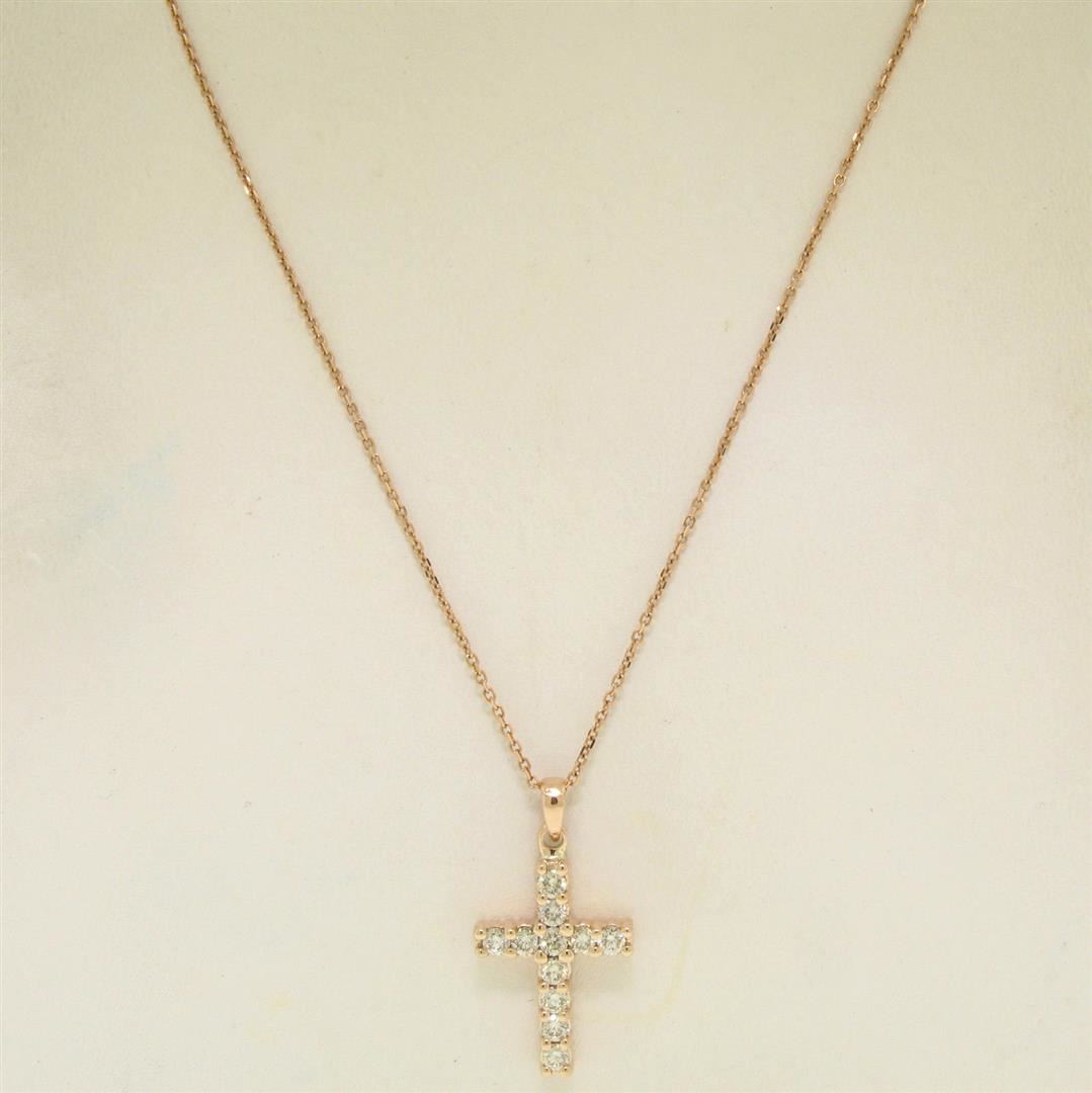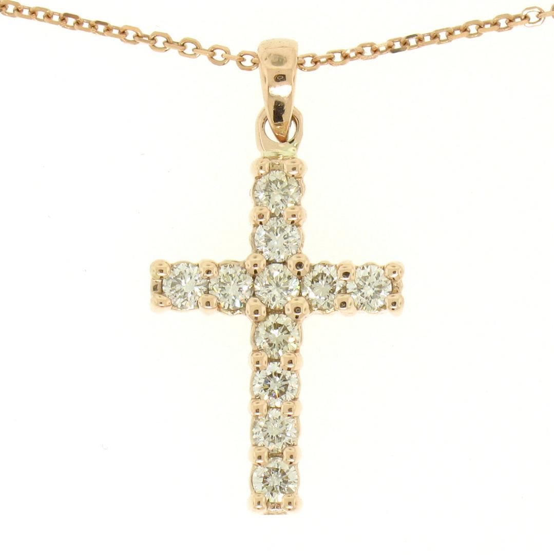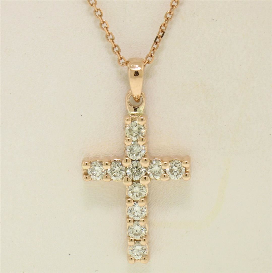One 14k Rose Gold 0.75ctw Round Brilliant Diamond Petite Cross Pendant w/ 16" Chain. Item Details: Material: 14k Solid Rose Gold, Weight: 4.0 Grams, Stone(s): (11) Natural Genuine Diamonds - Round Brilliant Cut - Shared Prong Set - VS2 Clarity - H/I Color, Total Carat Weight: 0.75, Chain Type: Fine Cable Link, Chain Length: 16 Inches, Clasp: Lobster Claw, Width: 13.74mm, Height (w/ Bail): 26.12mm, Height (w/o Bail): 22.29mm, Thickness: 3.74mm, Condition: New w/o Tag