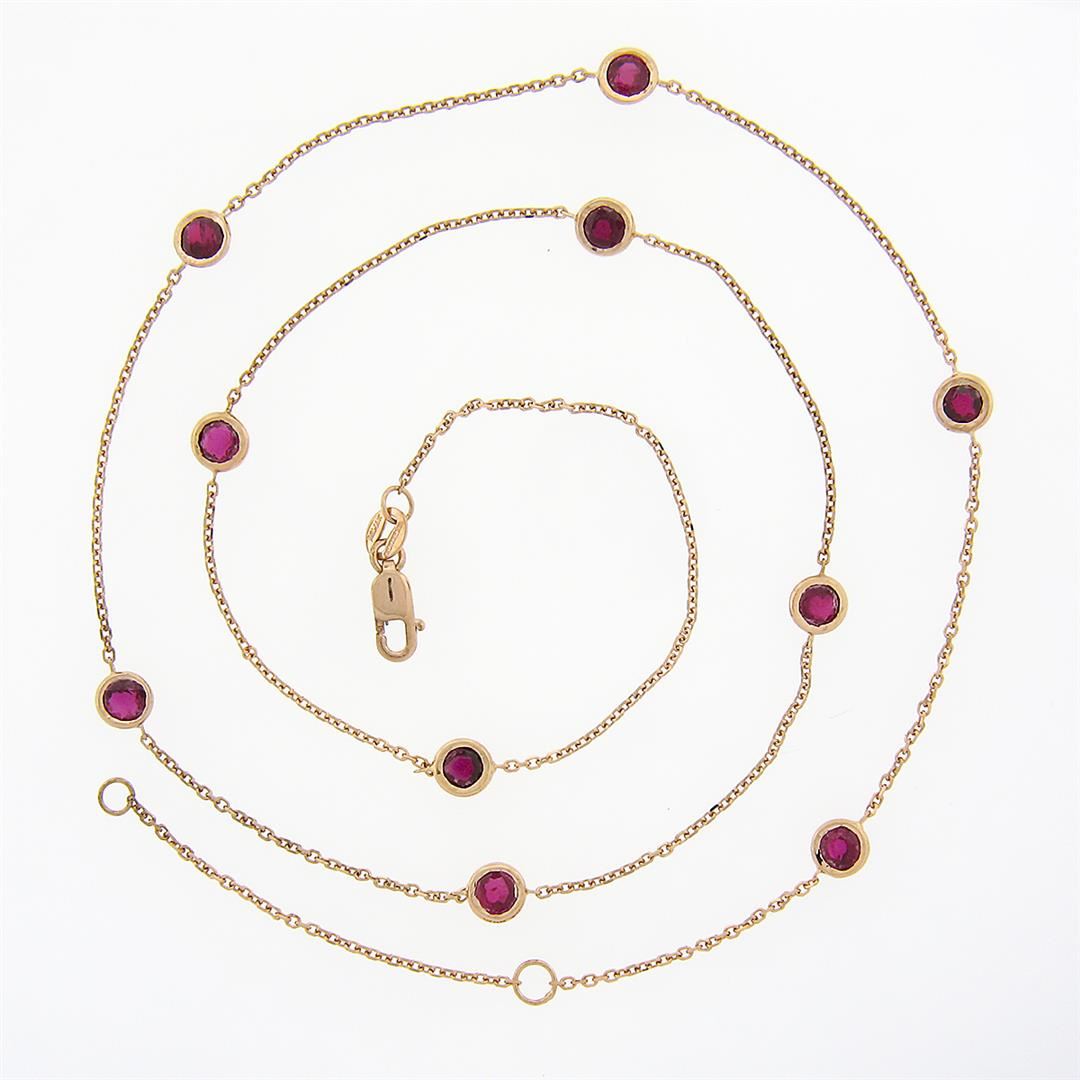 A solid 14k rose gold by the yard cable chain link necklace, with 10 round cut natural rubies (2ctw). It weighs a total of 3.43 grams, measures 4.8mm wide, and measures adjustable at 18.5 or 20 inches in length.