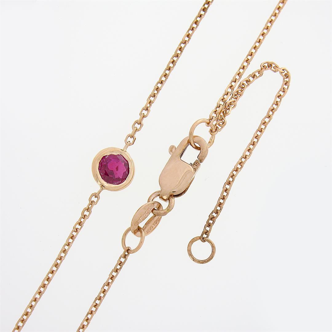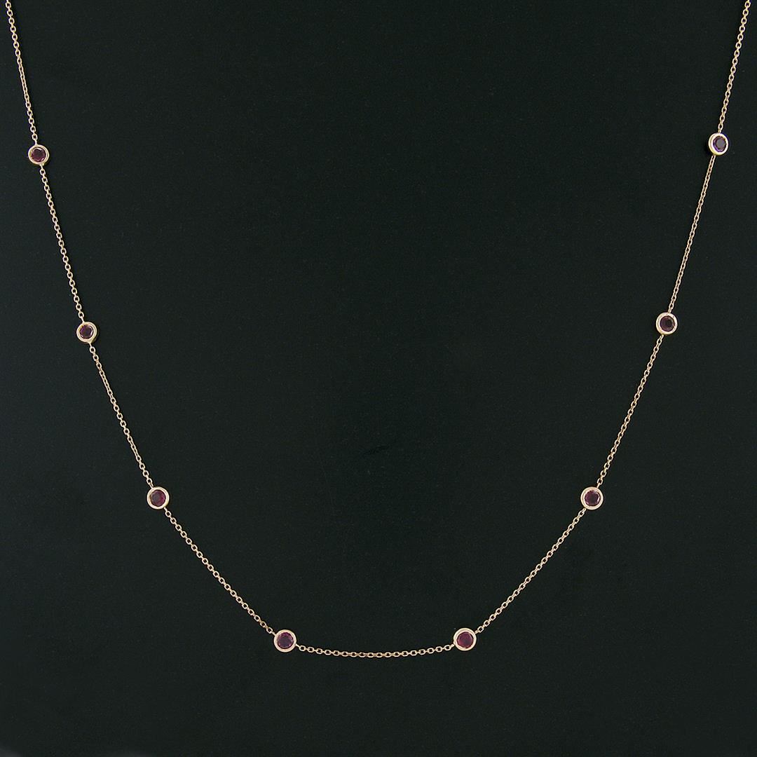 A solid 14k rose gold by the yard cable chain link necklace, with 10 round cut natural rubies (2ctw). It weighs a total of 3.43 grams, measures 4.8mm wide, and measures adjustable at 18.5 or 20 inches in length.