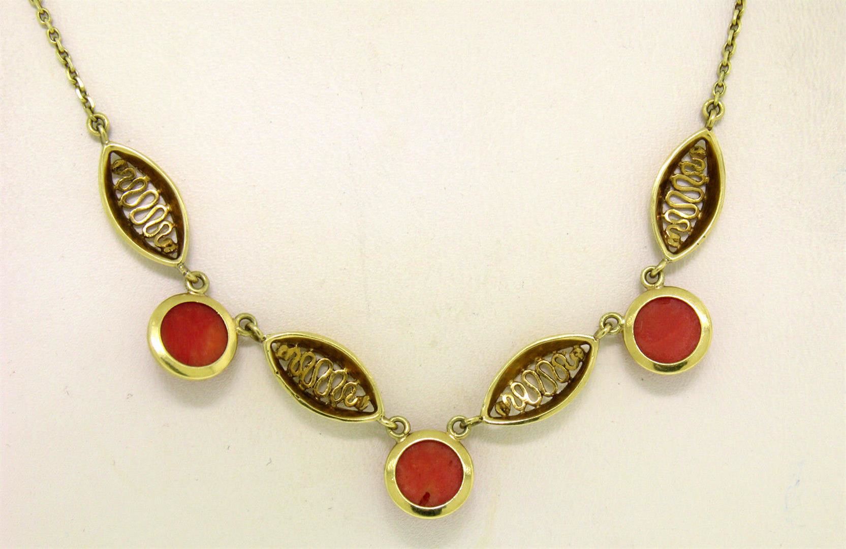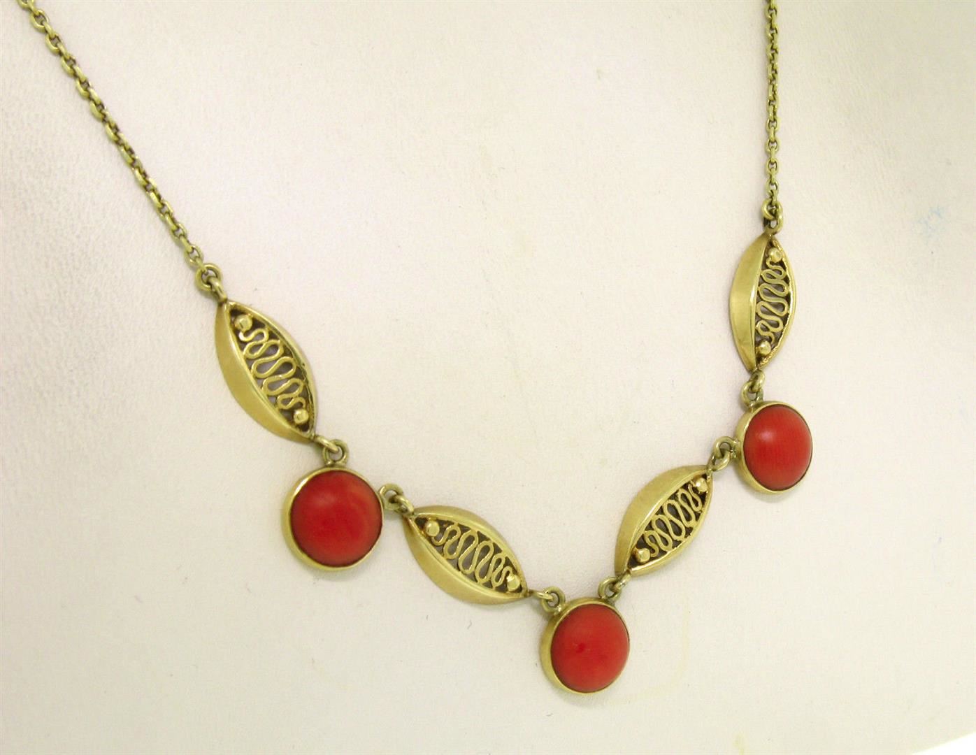 One Vintage 1950's 14k Solid Gold Ox Blood Coral Open Work Collar Necklace Chain. Item Details: Material: Solid 14k Yellow Gold, Weight: 7.30 Grams, Stone(s): (3) Natural Genuine Coral - Round Cabochon Cut - Bezel Set - Rich Ox Blood Red Color - 9.0mm (approx.), Chain Type: Cable Link, Necklace Length: 17 Inches wearable length - Center design measures 3.75 inches wide., Clasp: Spring Ring, Condition: Vintage piece. Excellent condition! Original Patina.