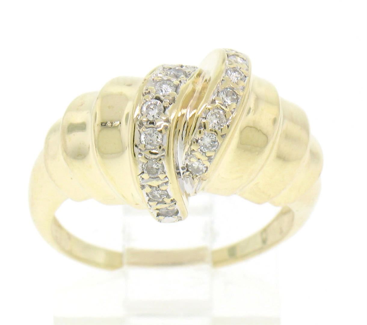 An estate solid 14k yellow gold french twist cocktail ring, featuring 18 round brilliant cut natural diamonds ( H - SI1; 0.25ctw). The ring is size 6.0, weighs a total of 4.80 grams, and measures 11.27mm wide.