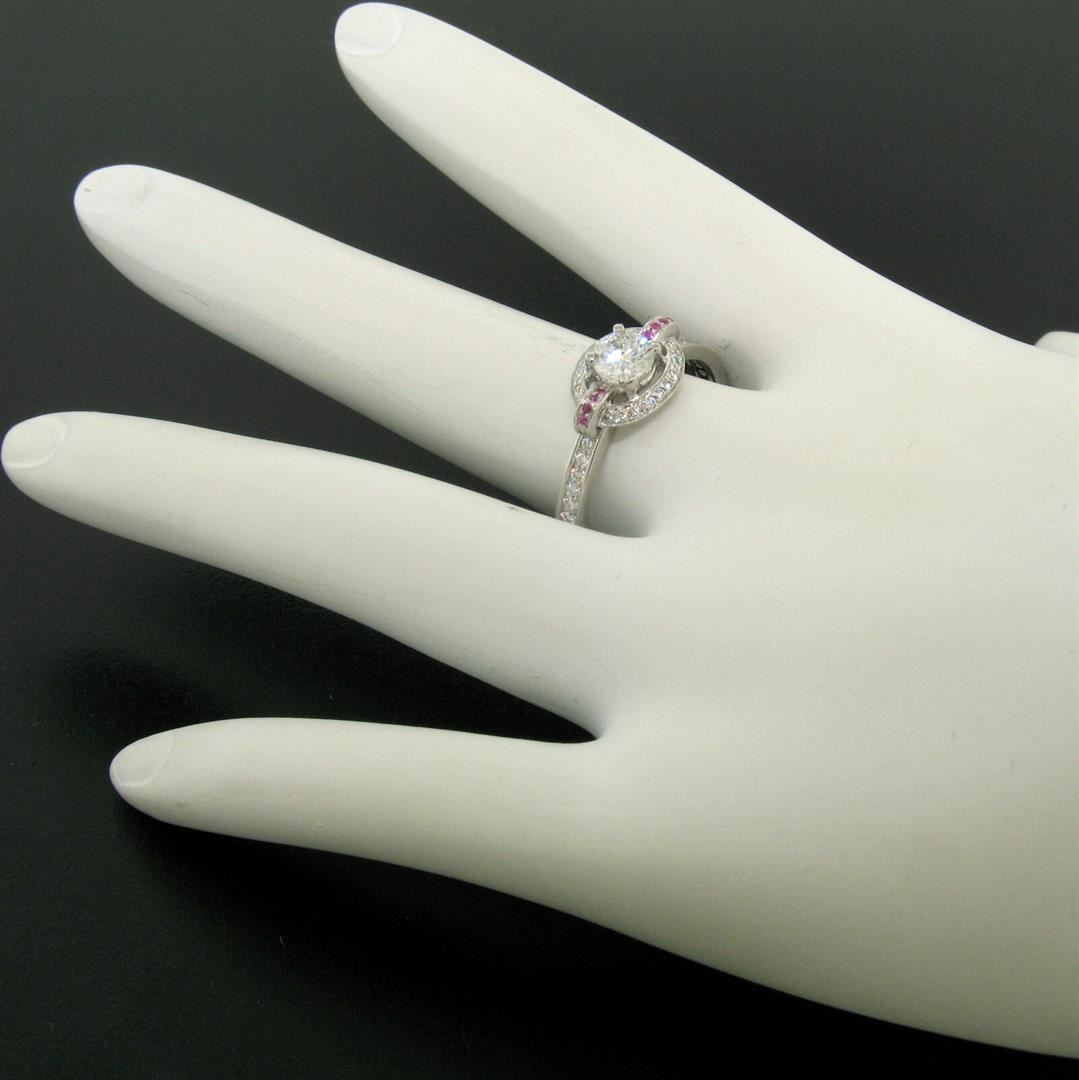 One 14k Solid White Gold 0.85ctw Round Pave Set Diamond & Pink Sapphire Halo Ring. Item Details: Material: 14k Solid White Gold, Weight: 3.4 Grams, Stone(s): (1) Natural Genuine Diamond - Round Brilliant Cut - Prong Set - F/G Color - VS1 Clarity - 0.50ct (approx.), (34) Natural Genuine Diamonds - Round Brilliant Cut - Pavé Set - F/G Color - VS1 Clarity - 0.30ctw (approx.), (8) Natural Genuine Sapphires - Round Cut - Pavé Set - Rich Pink Color - 0.05ctw (approx.), Total Carat Weight: 0.85 (approx.), Ring Size: 8.25 (We can custom size this ring.), Ring Width: 8.75mm, Ring Height: 5.05mm rise off the finger