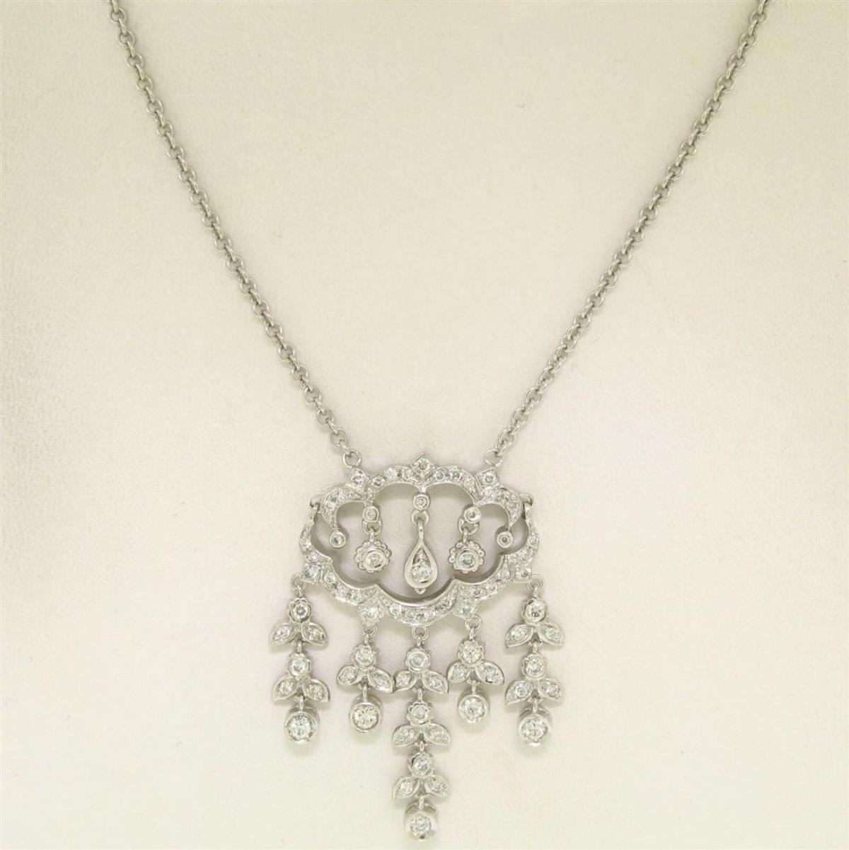 One 14k Solid White Gold 1.50ctw Round Brilliant Diamond Tassel Chandelier Necklace. Item Details: Material: 14k Solid White Gold, Weight: 11.1 Grams, Stone(s): (71) Natural Genuine Diamonds - Round Brilliant Cut - Bezel and Pavé Set - VS1/VS2 Clarity - F/G Color, Total Carat Weight: 1.50 (approx.), Chain Type: Cable Link, Chain Length: 17 Inches, Clasp: Lobster Claw, Width: 30.66mm, Height: 42.36mm, Thickness: 2.83mm, Condition: Excellent condition!