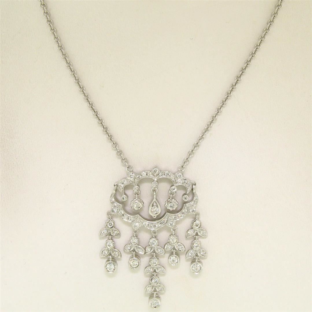 One 14k Solid White Gold 1.50ctw Round Brilliant Diamond Tassel Chandelier Necklace. Item Details: Material: 14k Solid White Gold, Weight: 11.1 Grams, Stone(s): (71) Natural Genuine Diamonds - Round Brilliant Cut - Bezel and Pavé Set - VS1/VS2 Clarity - F/G Color, Total Carat Weight: 1.50 (approx.), Chain Type: Cable Link, Chain Length: 17 Inches, Clasp: Lobster Claw, Width: 30.66mm, Height: 42.36mm, Thickness: 2.83mm, Condition: Excellent condition!