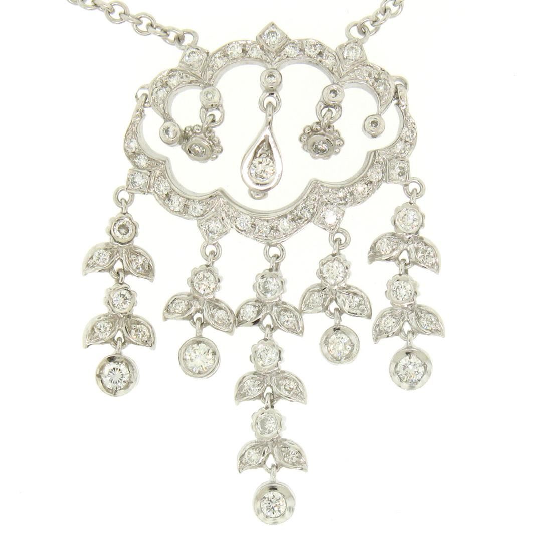 One 14k Solid White Gold 1.50ctw Round Brilliant Diamond Tassel Chandelier Necklace. Item Details: Material: 14k Solid White Gold, Weight: 11.1 Grams, Stone(s): (71) Natural Genuine Diamonds - Round Brilliant Cut - Bezel and Pavé Set - VS1/VS2 Clarity - F/G Color, Total Carat Weight: 1.50 (approx.), Chain Type: Cable Link, Chain Length: 17 Inches, Clasp: Lobster Claw, Width: 30.66mm, Height: 42.36mm, Thickness: 2.83mm, Condition: Excellent condition!