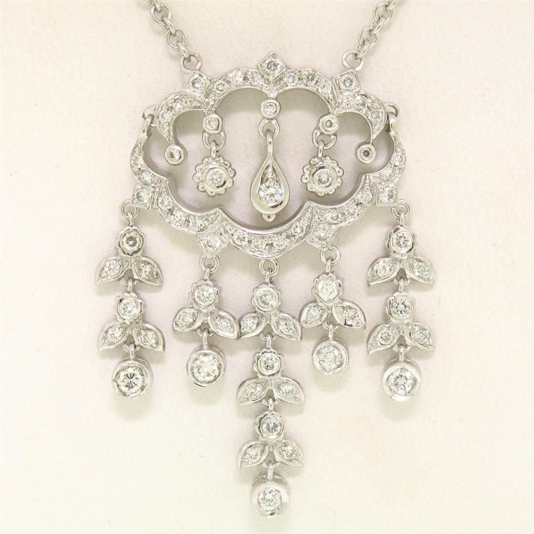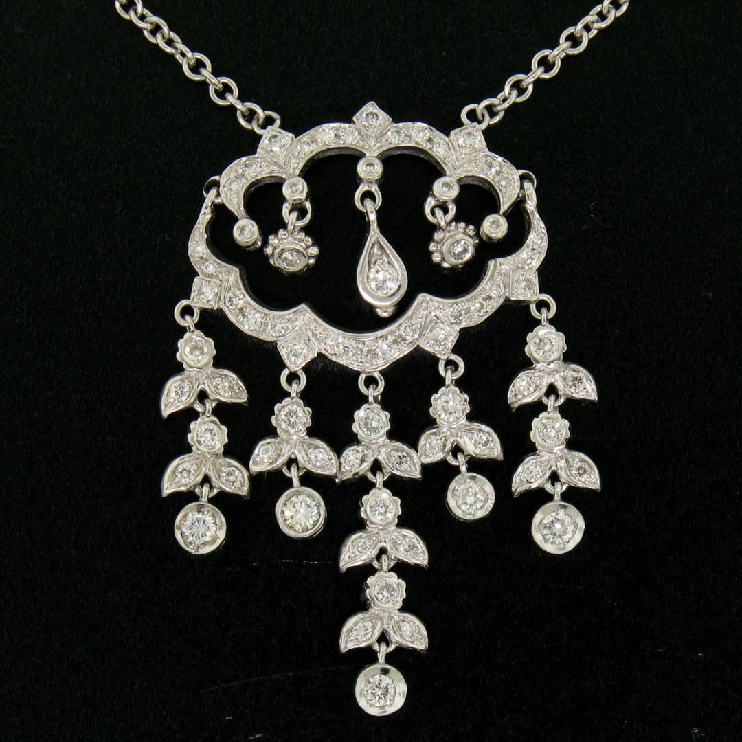 One 14k Solid White Gold 1.50ctw Round Brilliant Diamond Tassel Chandelier Necklace. Item Details: Material: 14k Solid White Gold, Weight: 11.1 Grams, Stone(s): (71) Natural Genuine Diamonds - Round Brilliant Cut - Bezel and Pavé Set - VS1/VS2 Clarity - F/G Color, Total Carat Weight: 1.50 (approx.), Chain Type: Cable Link, Chain Length: 17 Inches, Clasp: Lobster Claw, Width: 30.66mm, Height: 42.36mm, Thickness: 2.83mm, Condition: Excellent condition!