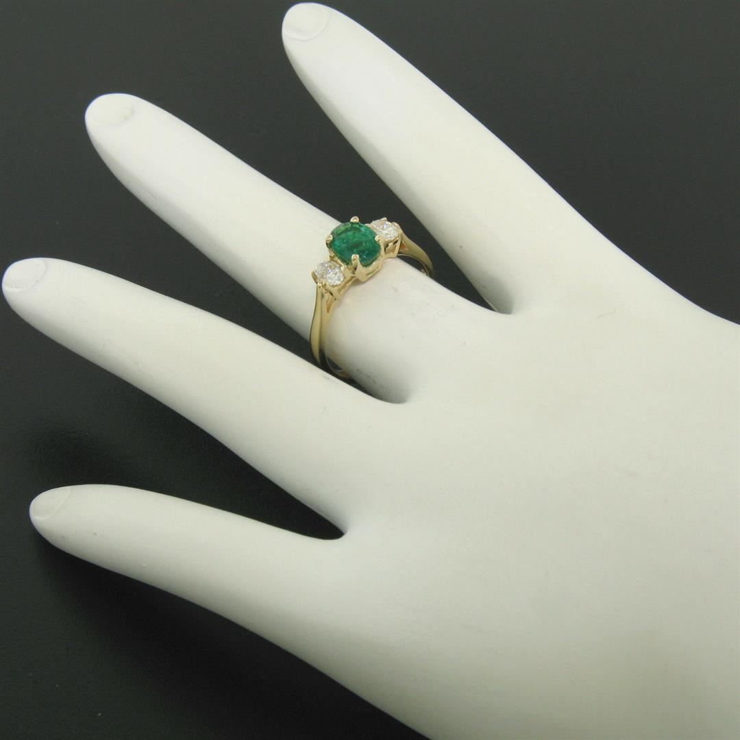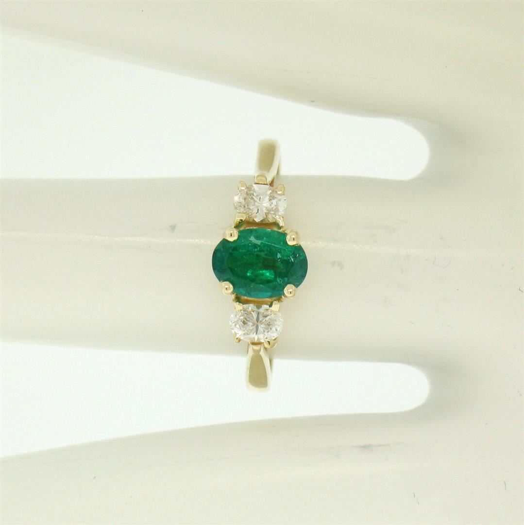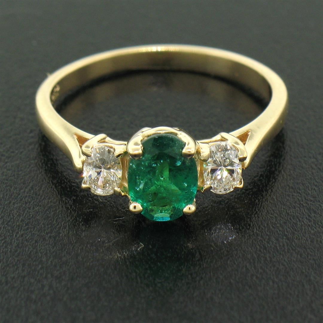 One 14k Solid Yellow Gold 1.03ctw Three Stone Prong Set Oval Emerald & Diamonds Ring. Item Details: Material: 14k Solid Yellow Gold, Weight: 2.30 Grams, Stone(s): (1) Natural Genuine Emerald- Oval Cut - Prong Set - Rich Green Color - Translucent - Very high quality - 0.63ctw, (2) Natural Genuine Diamonds - Oval Cut - Prong Set - VS1-VS2 Clarity - G-H Color- 0.40ctw Approx., Total Carat Weight: 1.03ctw, Ring Size: 6 (We can custom size this ring.), Ring Width: 6.81mm at its widest (Where the emerald is), Ring Height: 5.87mm rise off the finger at its highest point, Condition: Like New!