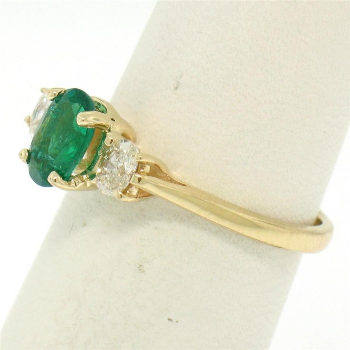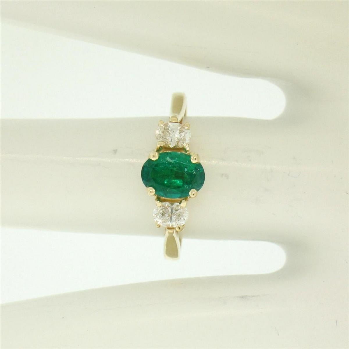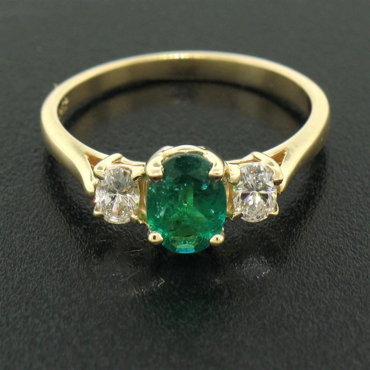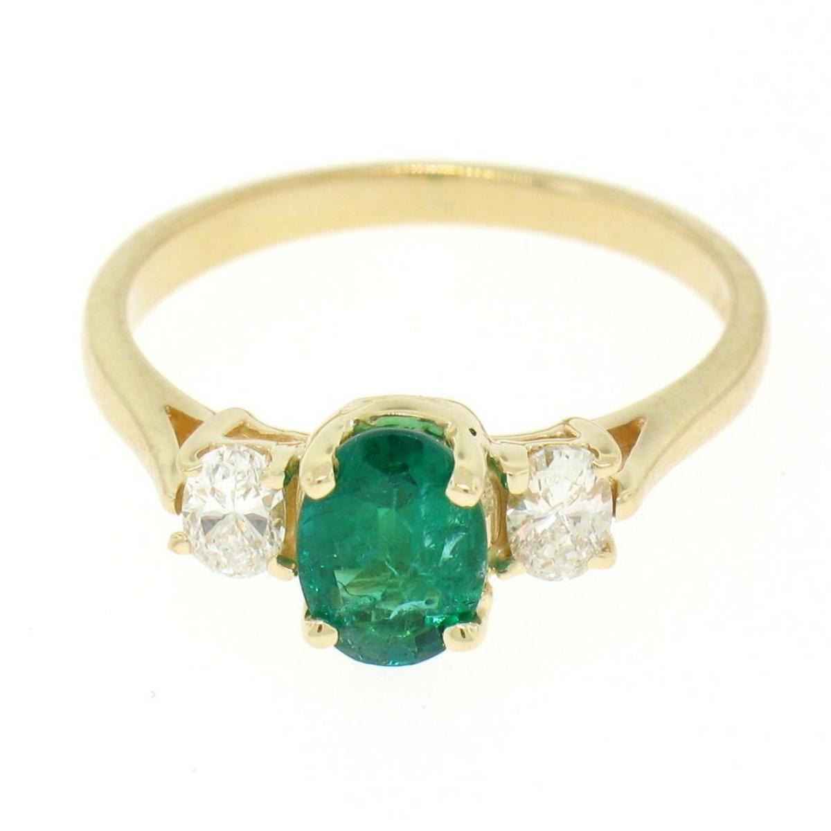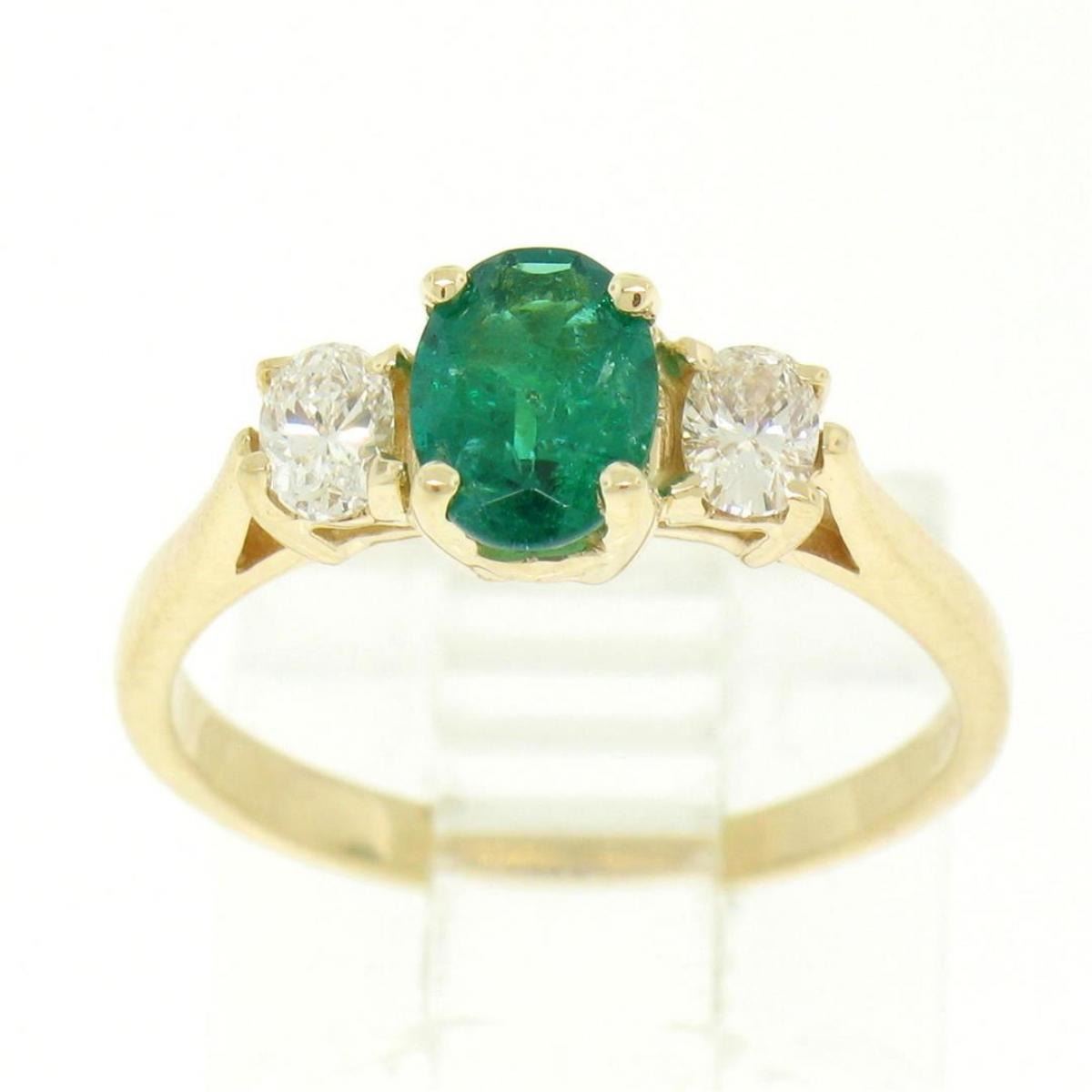 One 14k Solid Yellow Gold 1.03ctw Three Stone Prong Set Oval Emerald & Diamonds Ring. Item Details: Material: 14k Solid Yellow Gold, Weight: 2.30 Grams, Stone(s): (1) Natural Genuine Emerald- Oval Cut - Prong Set - Rich Green Color - Translucent - Very high quality - 0.63ctw, (2) Natural Genuine Diamonds - Oval Cut - Prong Set - VS1-VS2 Clarity - G-H Color- 0.40 ctw Approx., Total Carat Weight: 1.03ctw, Ring Size: 6 (We can custom size this ring.), Ring Width: 6.81mm at its widest (Where the emerald is), Ring Height: 5.87mm rise off the finger at its highest point, Condition: Like New!