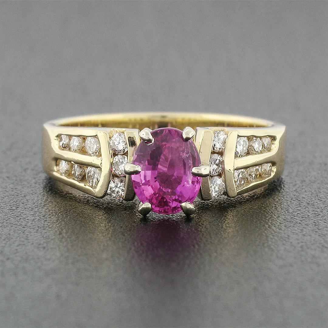 A solid 14k yellow & white gold engagement ring, with 1 oval cut natural pink sapphire (0.83ct ), and 18 round brilliant cut natural diamonds (F/G - VS1/VS2 ; 0.35ctw). The ring is size 6.5, weighs a total of 4.54 grams, and measures 6.8mm wide.