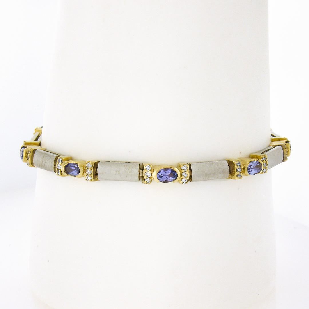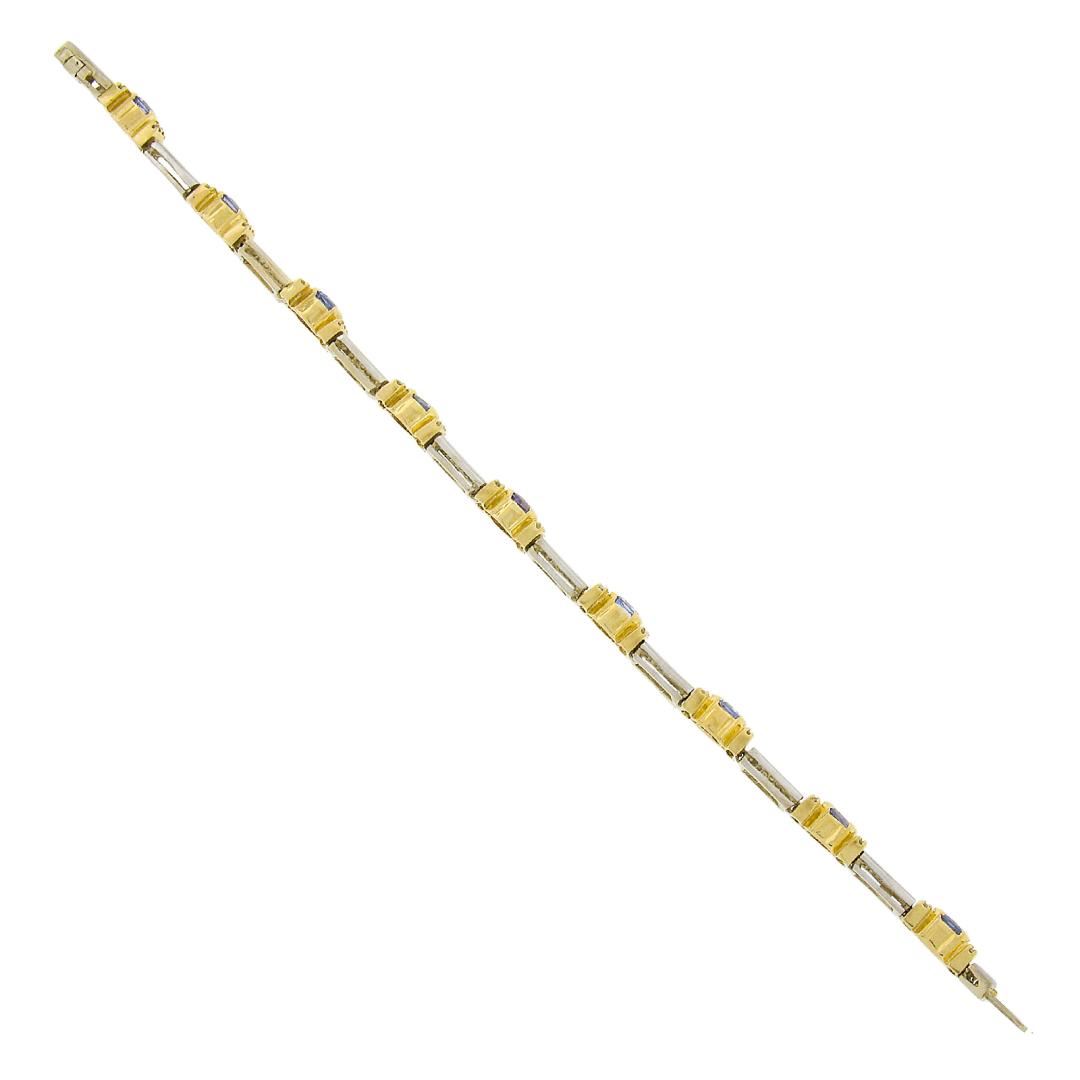A solid 14k yellow & white gold tennis bracelet, with 54 round cut natural diamonds (G/H - VS2/SI1 ; 0.62ctw), and 9 oval cut natural tanzanites (1.40ctw). It weighs a total of 16.37 grams, measures 4.5mm wide, and measures 6.75 inches in length.