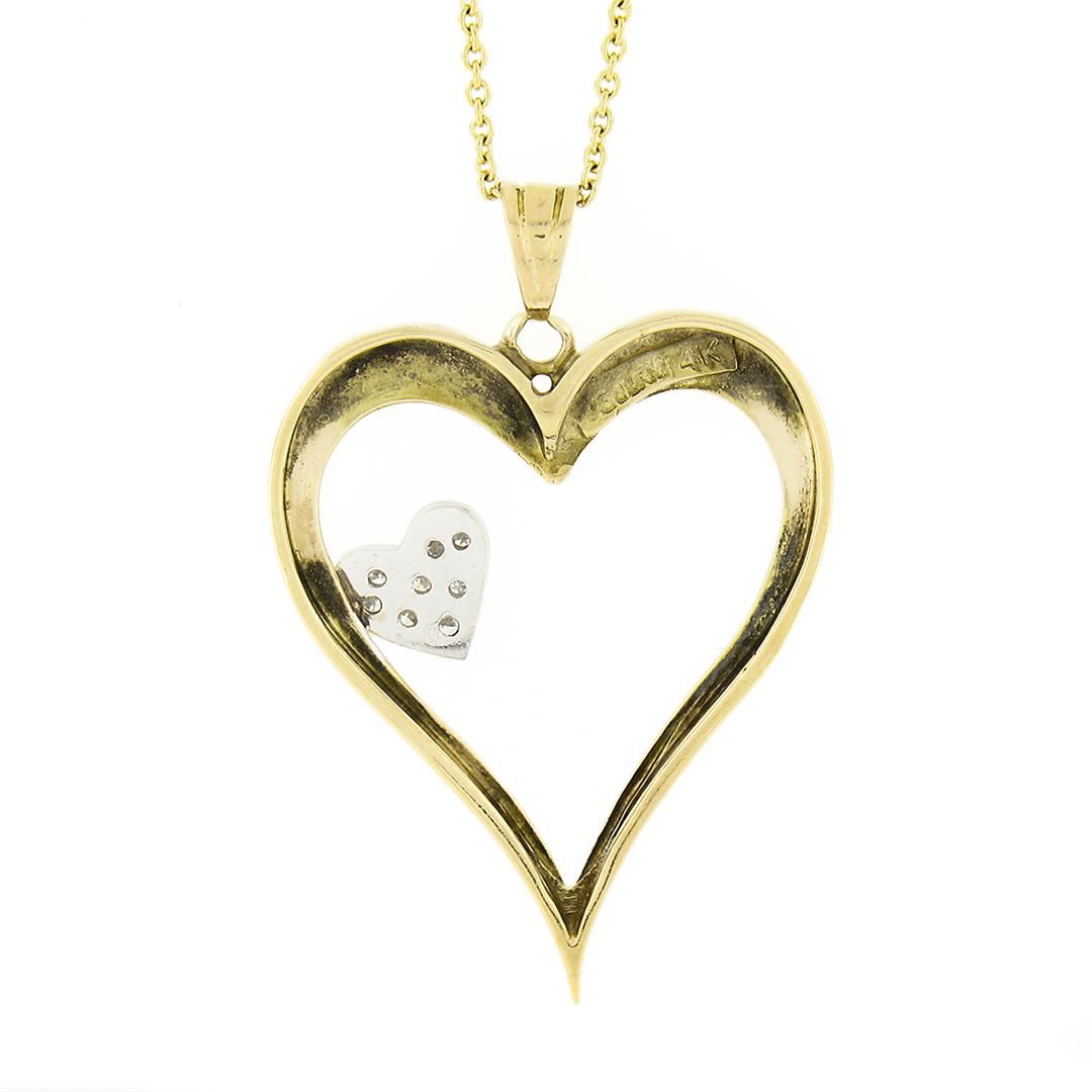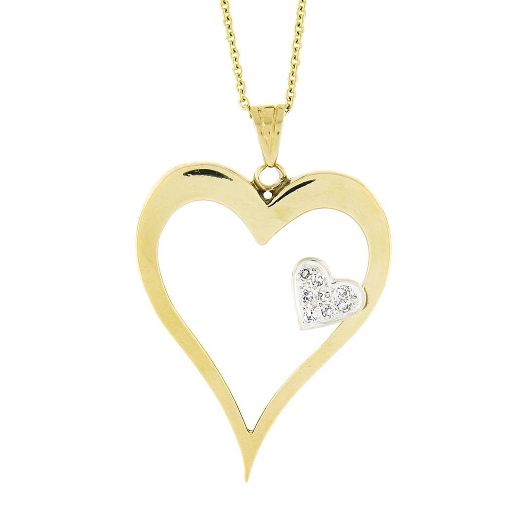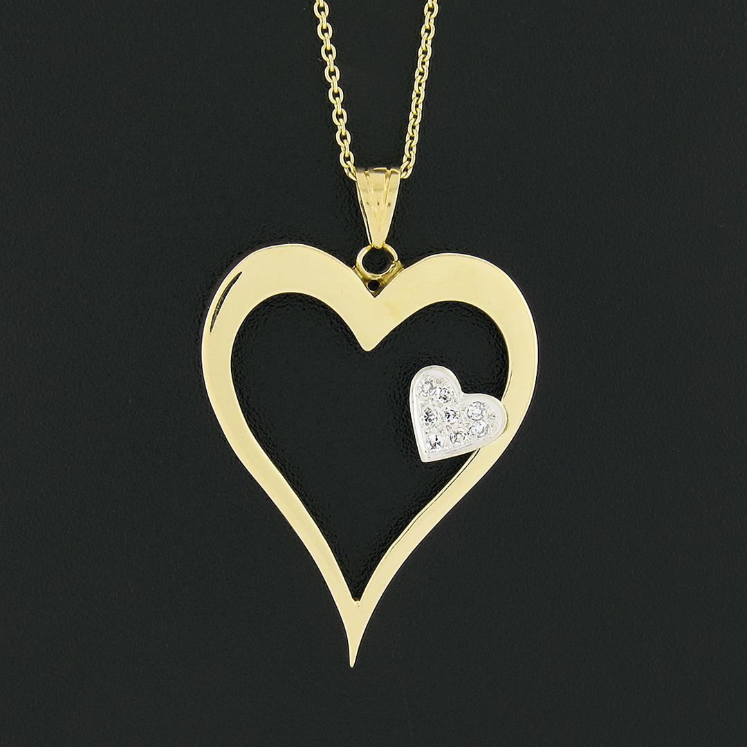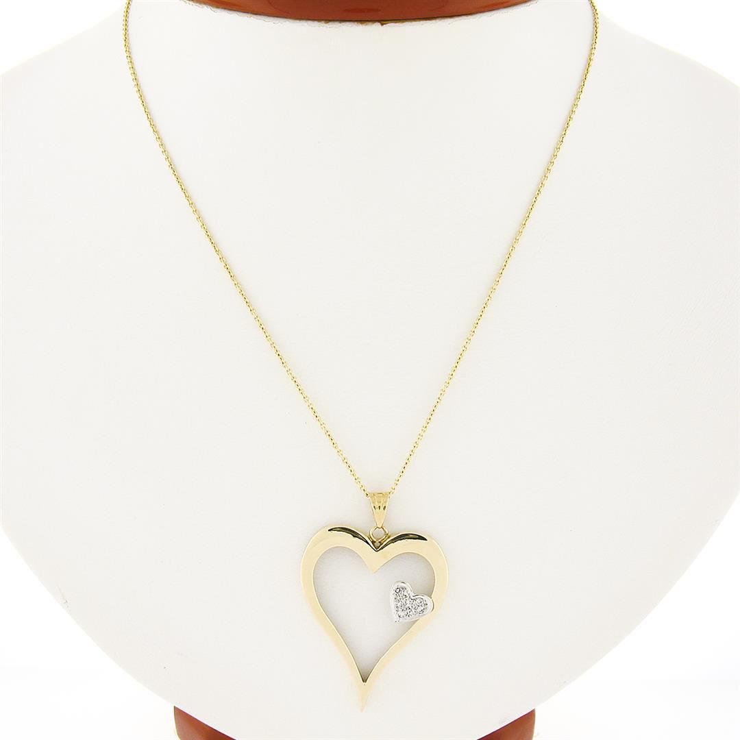 14k TT Gold Large Polished Open Heart w/ Diamond Heart Accent Pendant & Chain