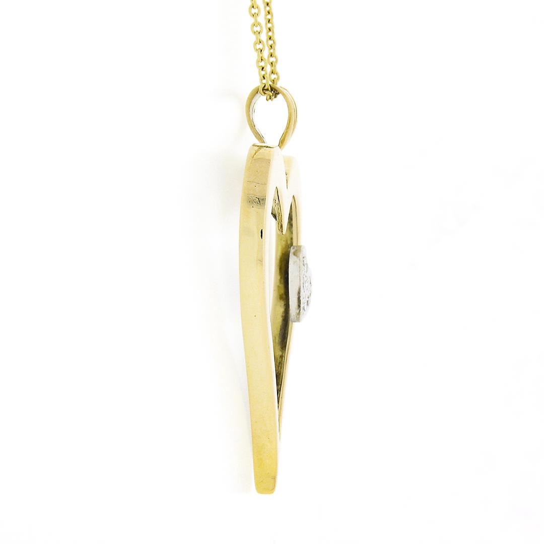 A solid 14k yellow & white gold heart pendant necklace, with 8 single cut natural diamonds (G/H - VS2/SI1; 0.12ctw). 18 inch cable link chain, 5.47 grams total weight, pendant measures 36.90x25mm.