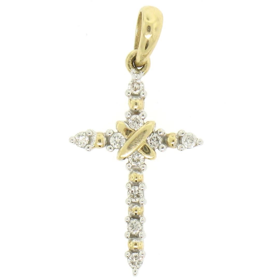 One 14k Two Tone Gold .20ctw Prong Set Round Brilliant Diamond Petite Cross Pendant. Item Details: Material: 14K Solid White & Yellow Gold, Weight: 1.10 Grams, Stone(s): (10) Natural Genuine Diamonds - Round Brilliant Cut - Prong Set - SI1 Clarity - G Color, Total Carat Weight: 0.20ctw (approx.), Chain Type: Not Included, Width: 11.96mm, Height (w/ Bail): 24.58mm, Height (w/o Bail): 20.10mm. Thickness: 2.64mm. Bail Measurements (Inside): 2.72x4mm. Condition: Like New!