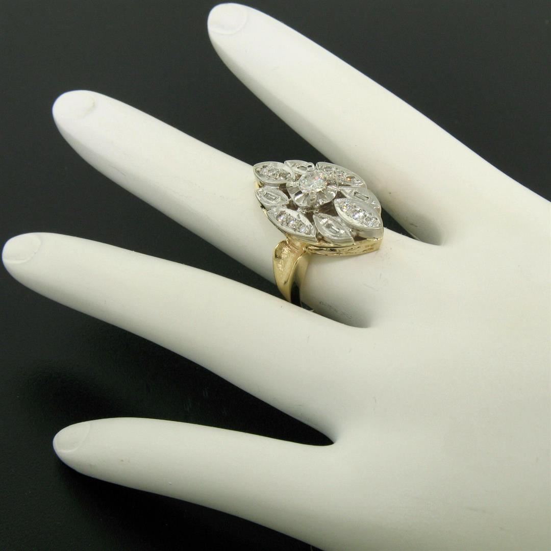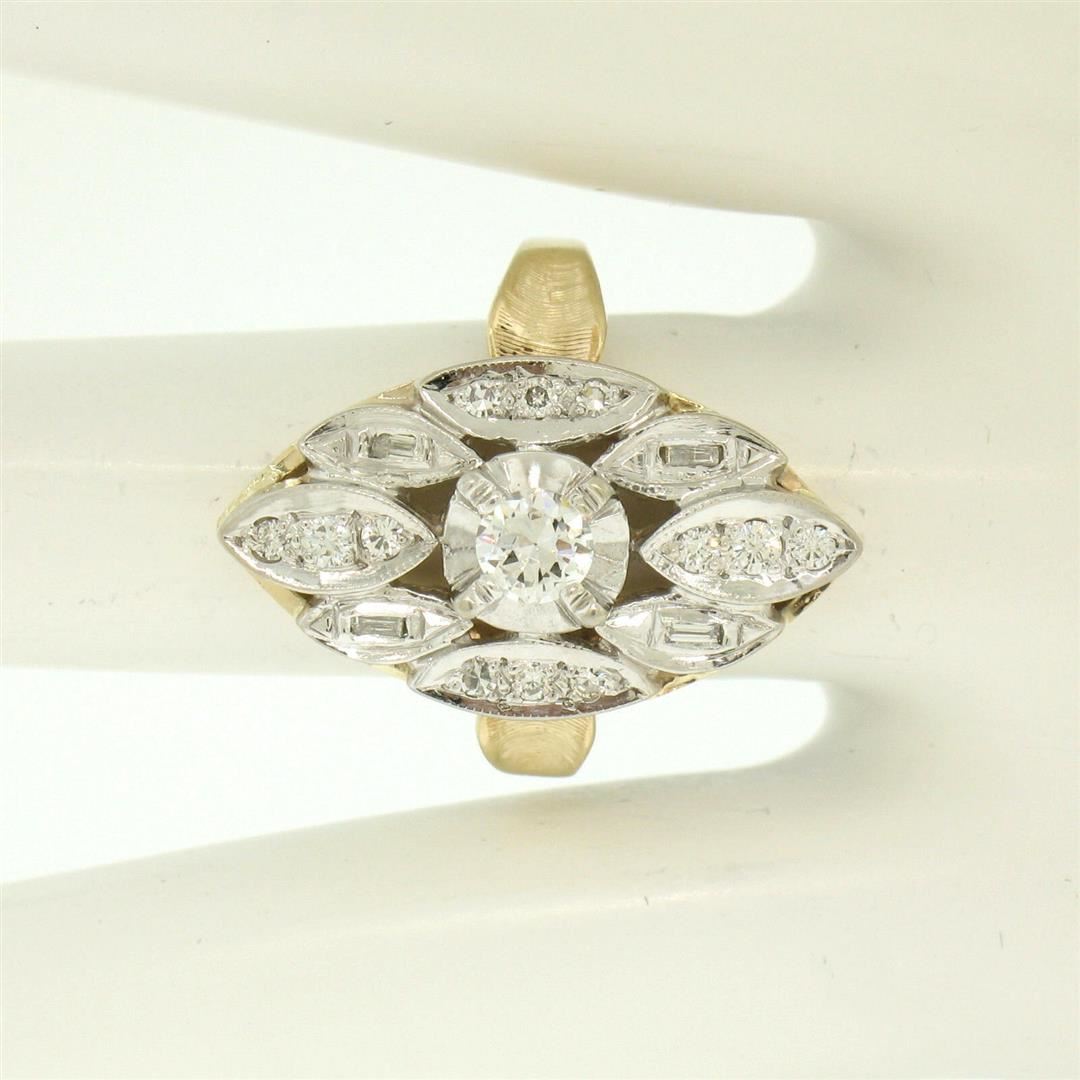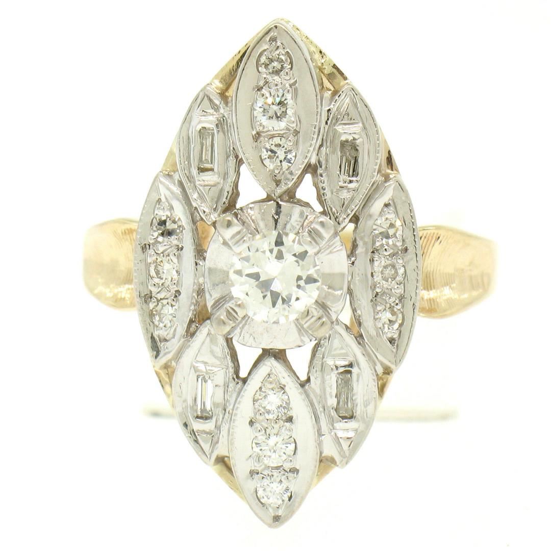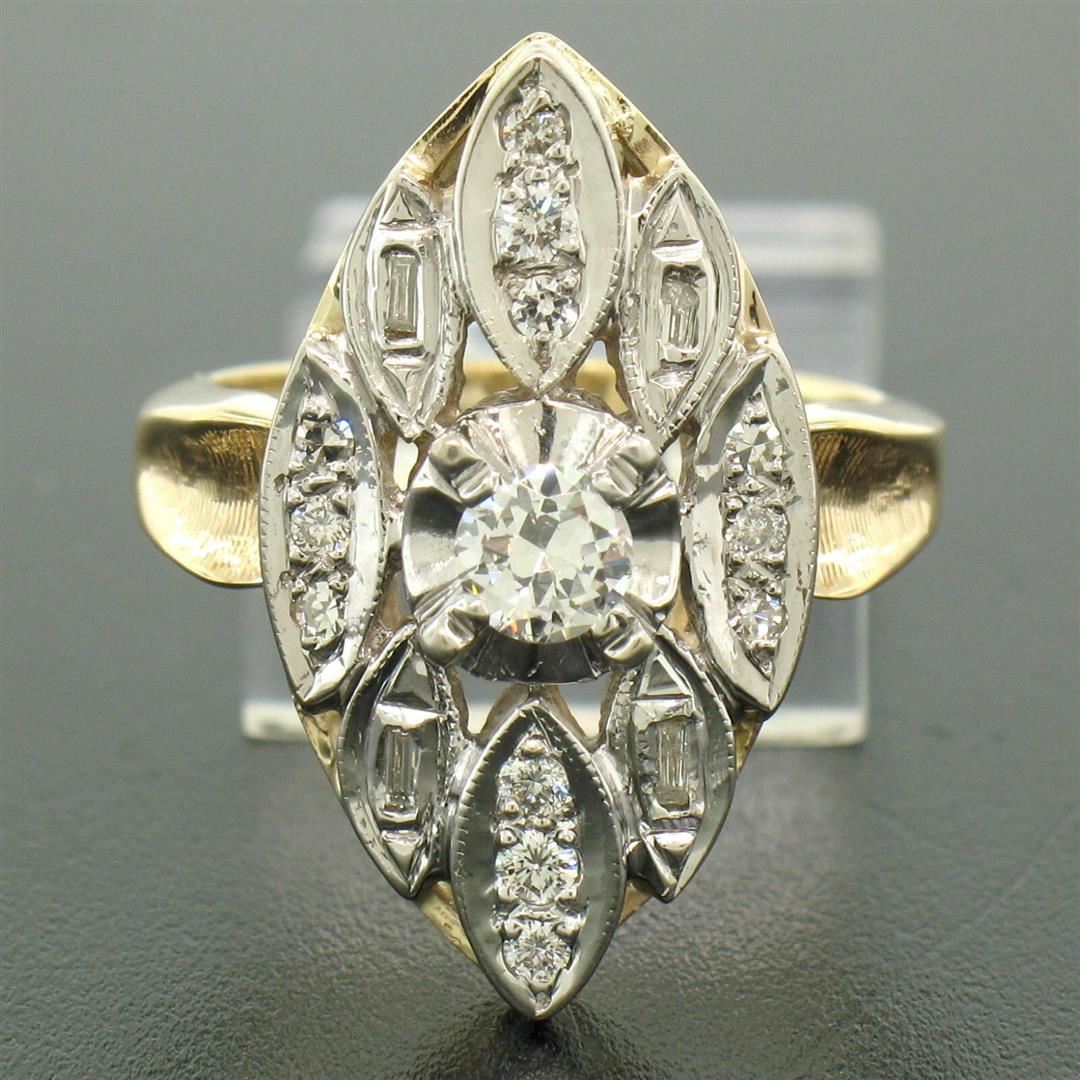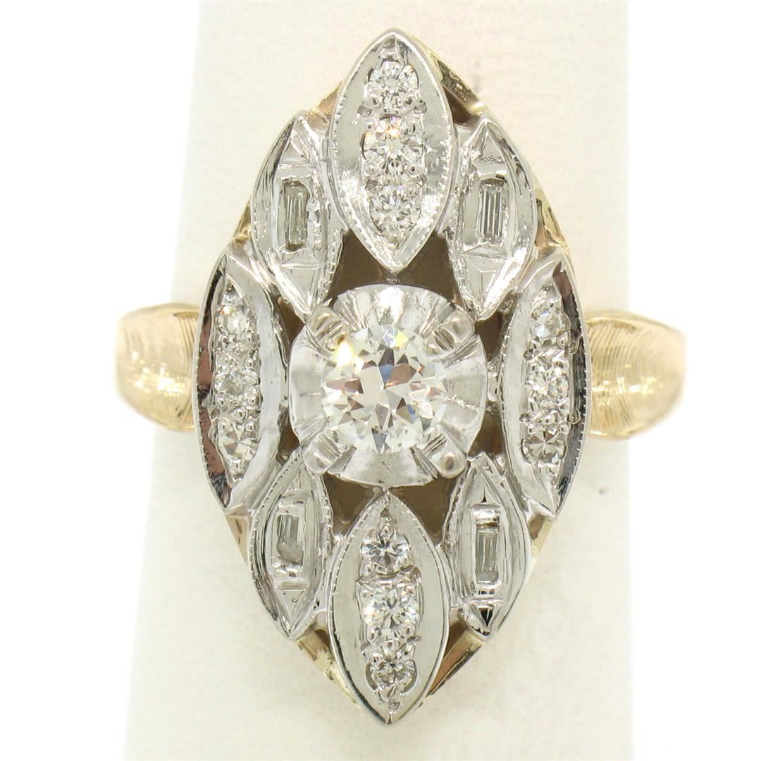 One Vintage Marquise Shaped 14k Two Tone Gold 0.55ctw European Cut Diamond Solitaire Ring. Item Details: Material: 14k Solid Yellow and White Gold, Weight: 8.5 Grams, Stone(s): (1) Natural Genuine Diamond - Round European Cut - Illusion Prong Set - F Color - SI1 Clarity - 0.33ct (approx.), (4) Natural Genuine Diamonds - Round Single Cut - Pavé Set - G Color - VS2/SI1 Clarity - 0.04ctw (approx.), (8) Natural Genuine Diamonds - Round Full Cut - Pavé Set - G Color - VS2/SI1 Clarity - 0.10ctw (approx.), (4) Natural Genuine Diamonds - Straight Baguette Cut - Bezel Set - G/H Color - VS2-SI2 Clarity - 0.08ctw (approx.), Total Carat Weight: 0.55 (approx.), Ring Size: 6.25 (We can custom size this ring.) Ring Width: 23.67mm Ring Height: 8.47mm rise off the finger Condition: Vintage piece. Excellent, ready to wear condition!