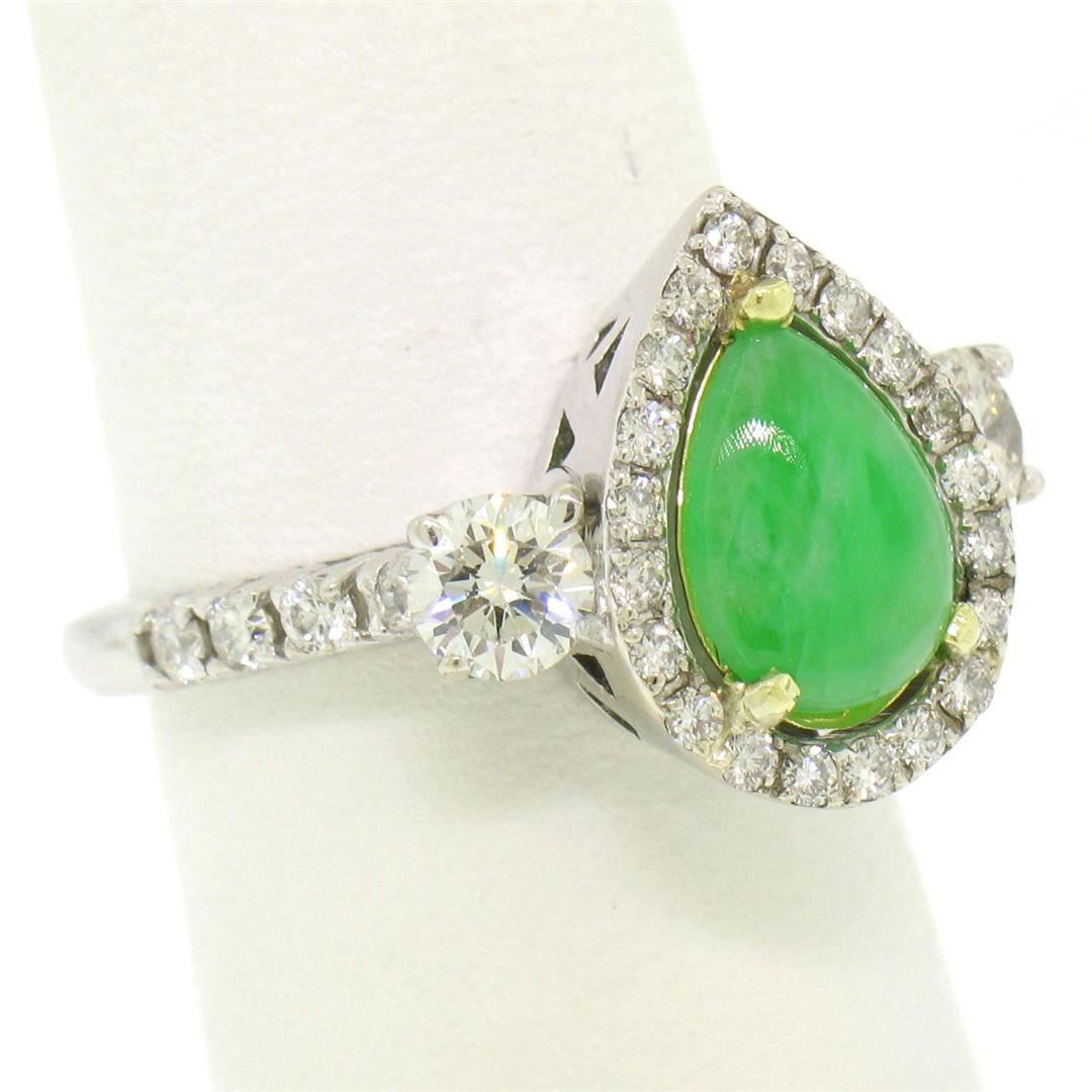 One Custom 14k White Gold Pear Jade & Large Diamond Accents w/ Halo Ladies Ring. Item Details: Material: 14k Solid White Gold w/ 14k Solid Yellow gold basket for the jade- CUSTOM!, Weight: 5.40 Grams, Stone(s): (1) Natural Genuine Nephrite (Jade) - Pear Cabochon Cut - Prong Set -Nice Even Green Colors - 9.60x6.70mm - Approx. 1.75ct, (30) Natural Genuine Diamonds - Round Cut - Prong/Pave Set - VS1-VS2 Clarity - F-G Color - 1.14ctw (approx.) ( The 2 largest diamonds total .64ctw together alone! NICE LARGE SIDE DIAMONDS!), Total Carat Weight: 2.89 (approx.), Ring Size: 6.0 (We can custom size this ring.), Ring Width: 14.60mm, Ring Height: 9.20mm rise off the finger, Condition: Estate piece. LIKE NEW condition!