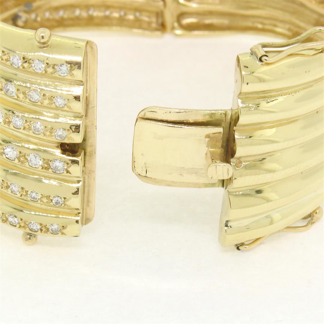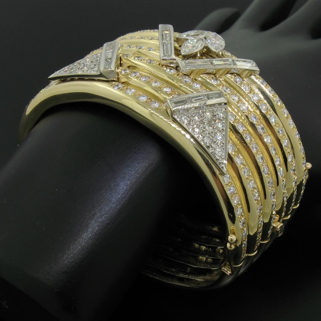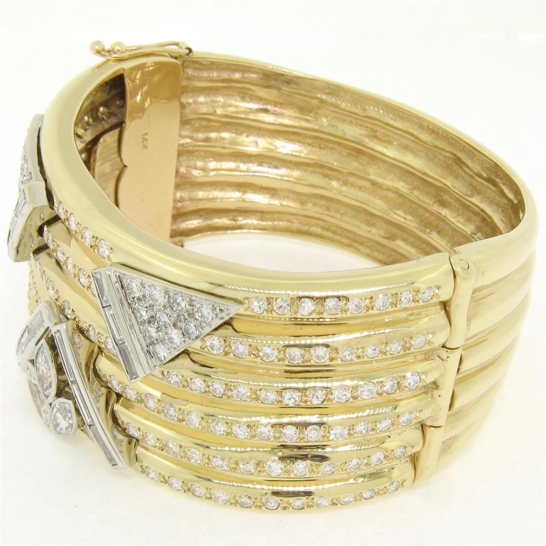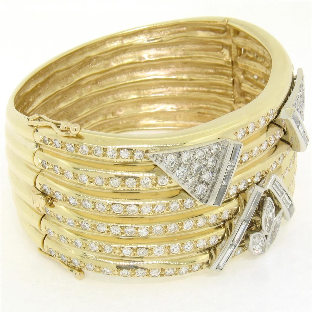 One Vintage Custom 14k Two Tone Gold Ribbed 6.25" 12ctw Diamond Wide Bangle Cuff Bracelet. Item Details - Material: Solid 14k Yellow Gold, Weight: 102.58 Grams, Stone(s): (3) Natural Genuine Diamonds - Marquise Cut - Bezel Set - F to H Color - VVS2 to VS2 Clarity - 1.80ctw (approx.), (12) Natural Genuine Diamonds - Straight Baguette Cut - Channel Set - F to H Color - VVS2 to VS2 Clarity - 3.20ctw (approx.), (171) Natural Genuine Diamonds - Round Brilliant Cut - Pavé Set - F to H Color - VVS2 to VS2 Clarity - 7.00ctw (approx.), Total Carat Weight: 12.00 (approx.), Clasp: Box Clasp w/ Dual Safety Latches (Very secure!), Size: Will fit up to a 6.25" wrist, Width: Inside: 56.33mm (2.21") - Outside: 66.80mm (2.63"), Height: Inside: 50.09mm (1.97") - Outside: 61.12mm (2.40"), Thickness: 7.42mm rise off the wrist, Condition: Vintage custom made bracelet. Excellent, ready to wear condition!