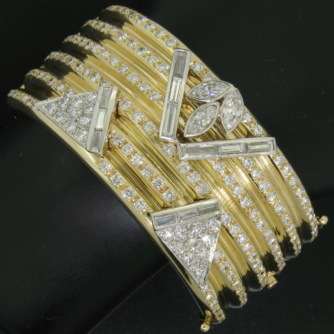 One Vintage Custom 14k Two Tone Gold Ribbed 6.25" 12ctw Diamond Wide Bangle Cuff Bracelet. Item Details - Material: Solid 14k Yellow Gold, Weight: 102.58 Grams, Stone(s): (3) Natural Genuine Diamonds - Marquise Cut - Bezel Set - F to H Color - VVS2 to VS2 Clarity - 1.80ctw (approx.), (12) Natural Genuine Diamonds - Straight Baguette Cut - Channel Set - F to H Color - VVS2 to VS2 Clarity - 3.20ctw (approx.), (171) Natural Genuine Diamonds - Round Brilliant Cut - Pavé Set - F to H Color - VVS2 to VS2 Clarity - 7.00ctw (approx.), Total Carat Weight: 12.00 (approx.), Clasp: Box Clasp w/ Dual Safety Latches (Very secure!), Size: Will fit up to a 6.25" wrist, Width: Inside: 56.33mm (2.21") - Outside: 66.80mm (2.63"), Height: Inside: 50.09mm (1.97") - Outside: 61.12mm (2.40"), Thickness: 7.42mm rise off the wrist, Condition: Vintage custom made bracelet. Excellent, ready to wear condition!