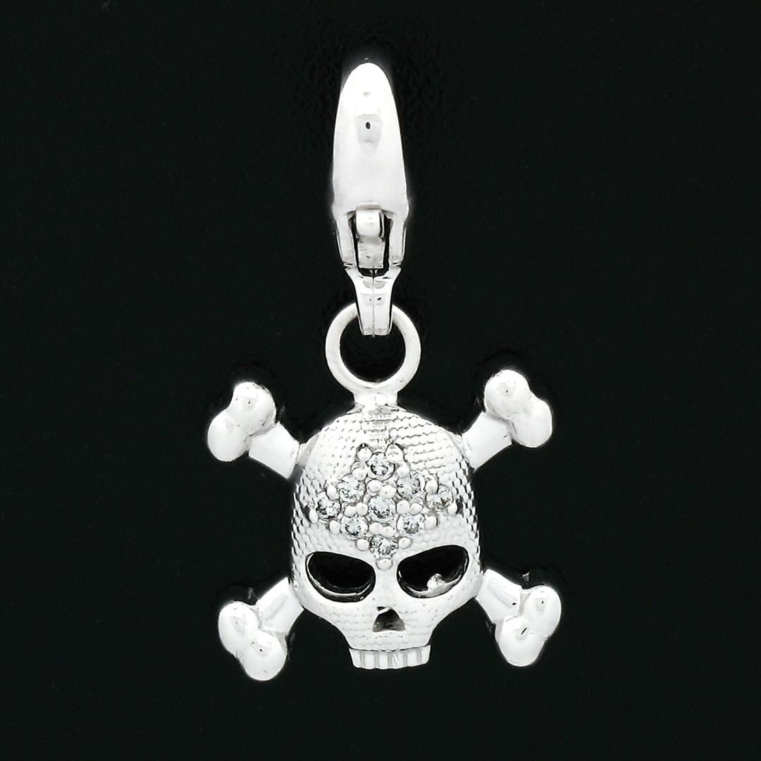 A solid 14k white gold skull & crossbones charm pendant, with 9 round brilliant cut natural dimaonds (F/G - VS1/VS2; 0.12ctw). The pendant weighs a total of 2.81 grams, measures 24.13x13.20mm including the bail, and the inside of the bail measures 3.6mm.