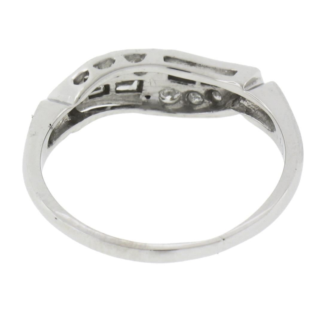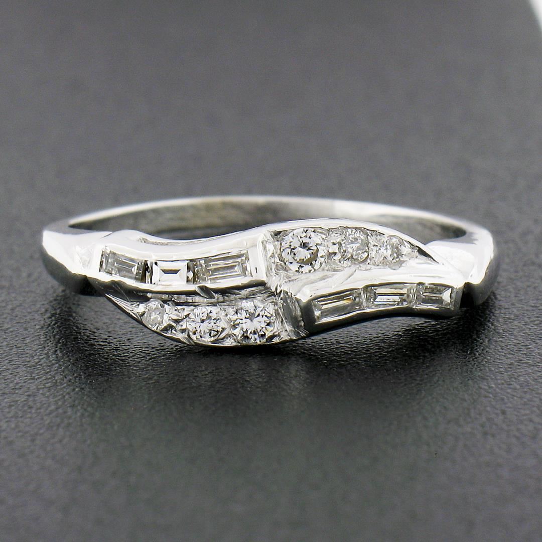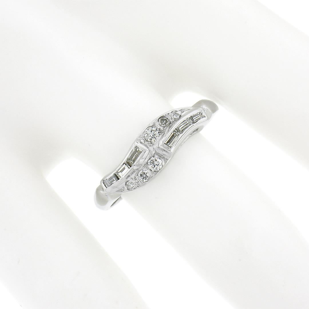 A solid 14k white gold band ring, with 6 straight baguette cut natural diamonds (H/I - VS1-SI1 ; 0.18ctw), and 6 round cut natural diamonds (H/I - SI1-I1 ; 0.10ctw). The ring is size 8.5, weighs a total of 2.63 grams, and measures 5.4mm wide.