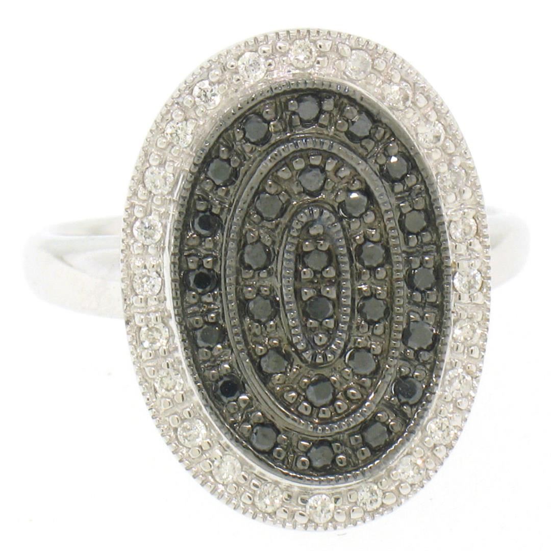 14k White Gold 0.50ctw 51 Round White & Black Diamond Tiered Oval Cocktail Ring. Please see photos and description for all available information. A new solid 14k white gold cocktail ring, with 27 round brilliant cut natural black diamonds, surrounded with a halo of 24 round brillaint cut natural white diamonds (G- SI1; 0.50ctw). The ring is size 7.0, weighs a total of 5.2 grams, and measures 14.40mm wide.