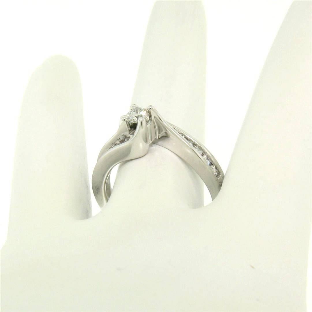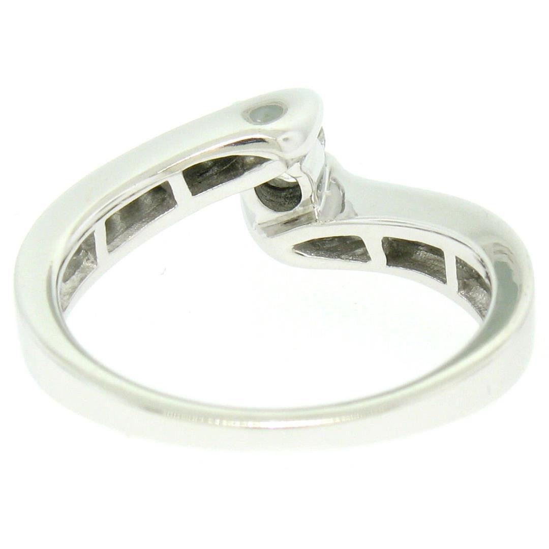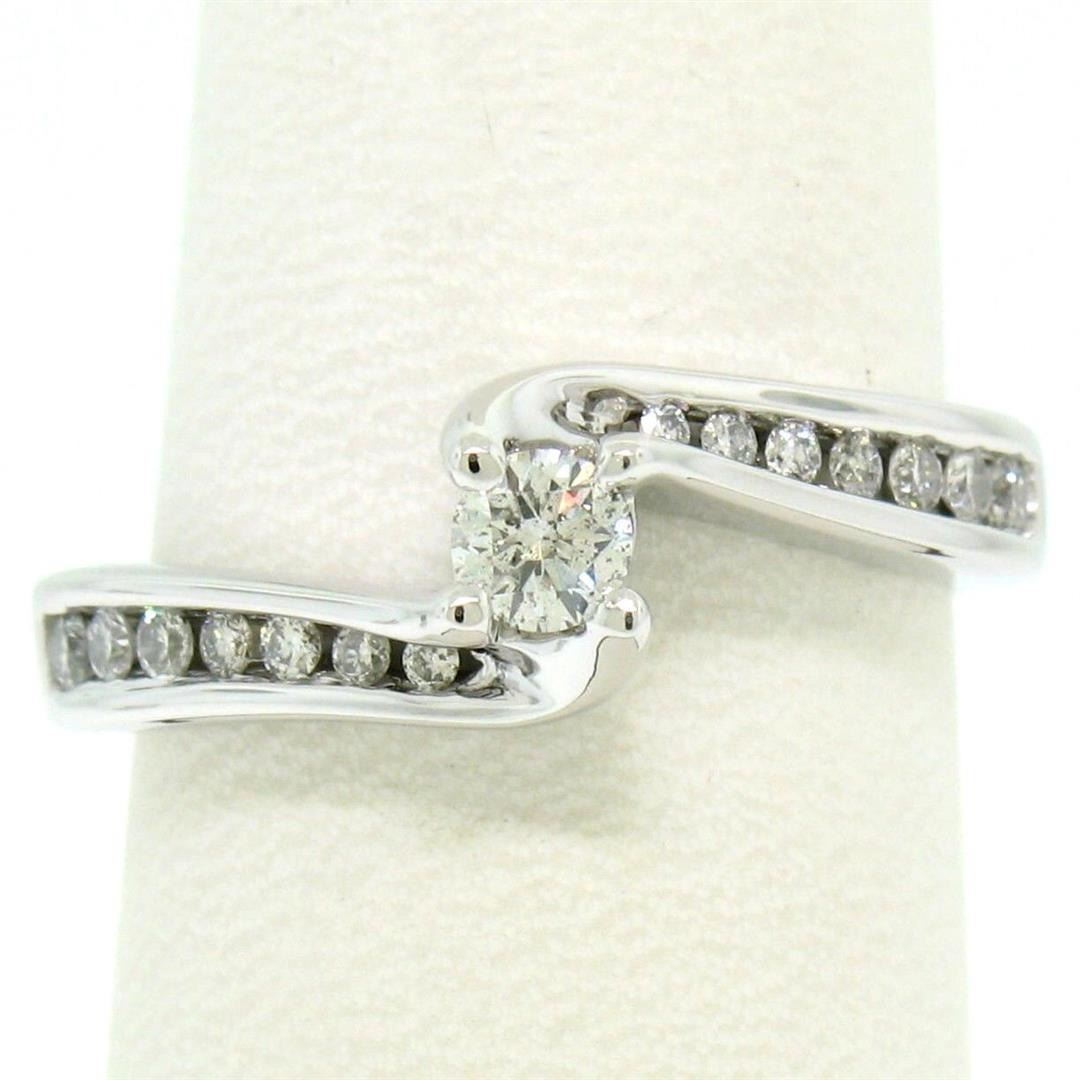An estate solid 14k white gold solitaire twist bypass ring, featuring 1 round brilliant cut natural diamond (G/H - SI2; 0.18ct), accented with 14 round brilliant cut natural diamonds (G/H - SI2; 0.37ctw). The ring is size 7.0, weighs a total of 4.7 grams, and measures 7.2mm wide.