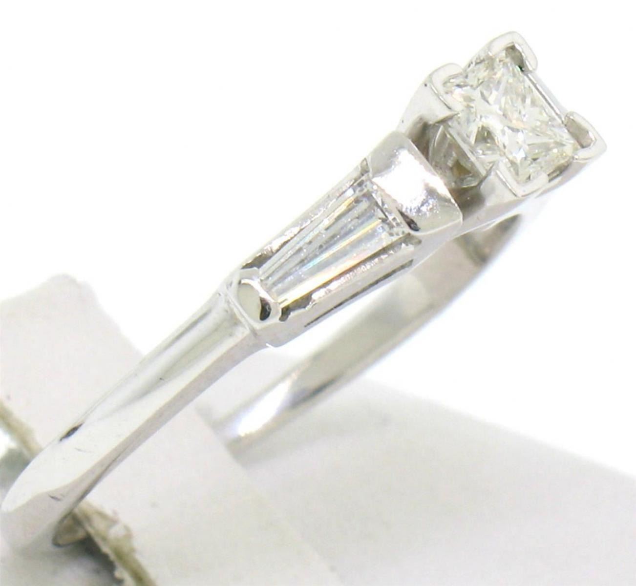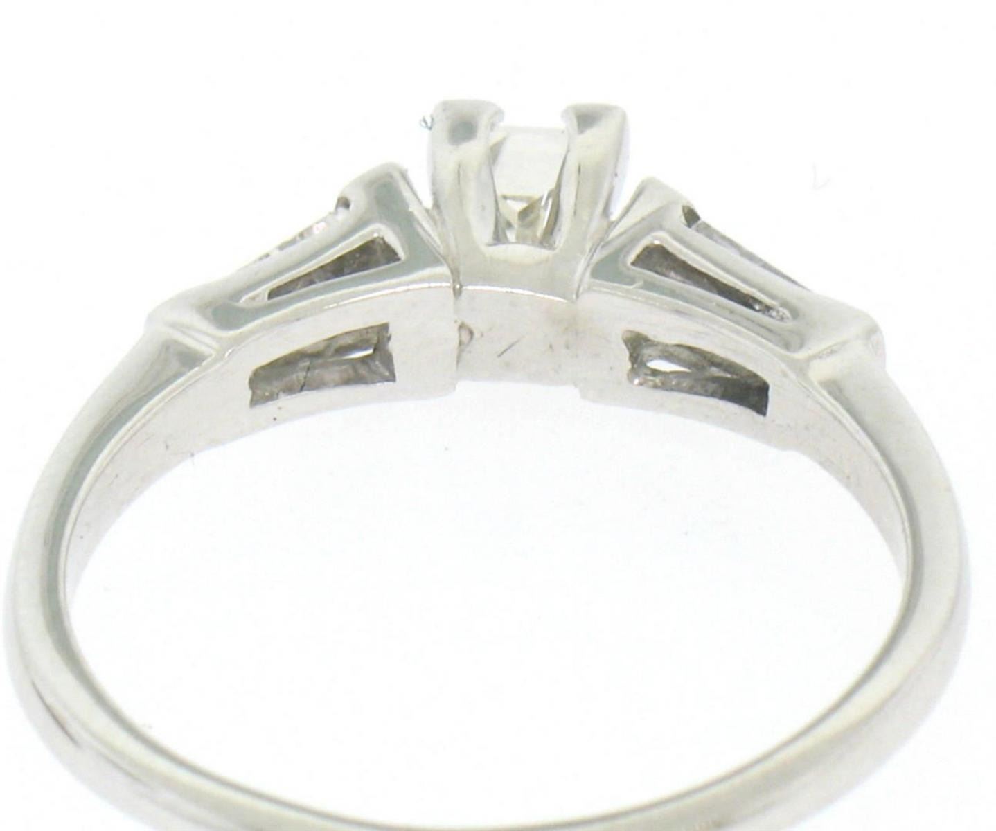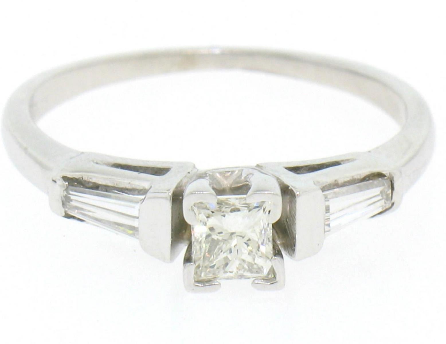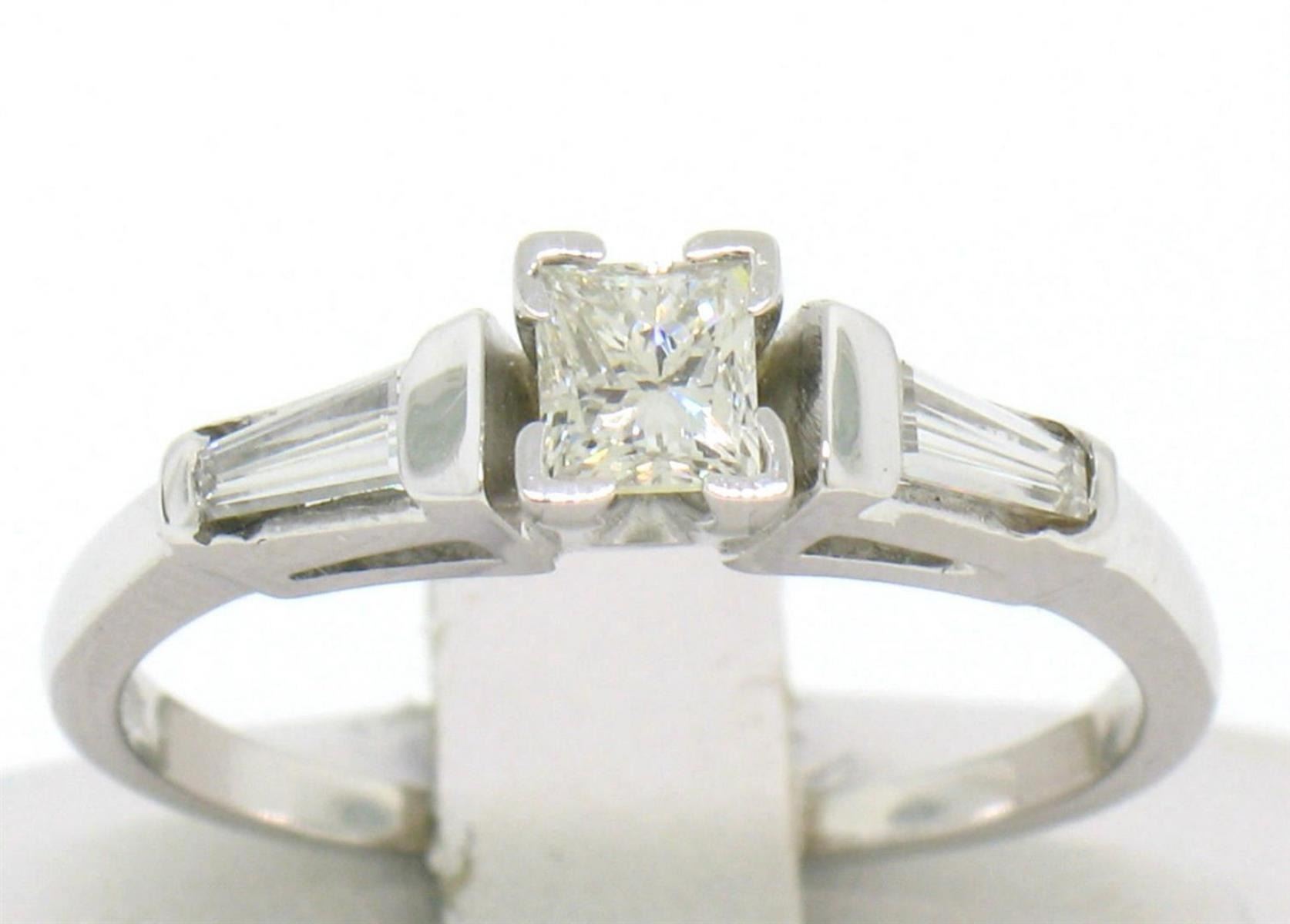 One 14k White Gold 0.66ctw Princess Diamond Engagement Ring Tapered Baguette Accents. Item Details: Material: 14k Solid White Gold, Weight: 3.2 Grams, Stone(s): (1) Natural Genuine Diamond - Princess Cut - H Color - VS1 Clarity - 0.30ct (approx.), (2) Natural Genuine Diamonds - Tapered Baguette Cut - G Color - VS1 Clarity - 0.36ctw (approx.), Total Carat Weight: 0.66 (approx.), Ring Size: 7.5 (We can custom size this ring.), Ring Width: 16.25mm, Condition: Like New!