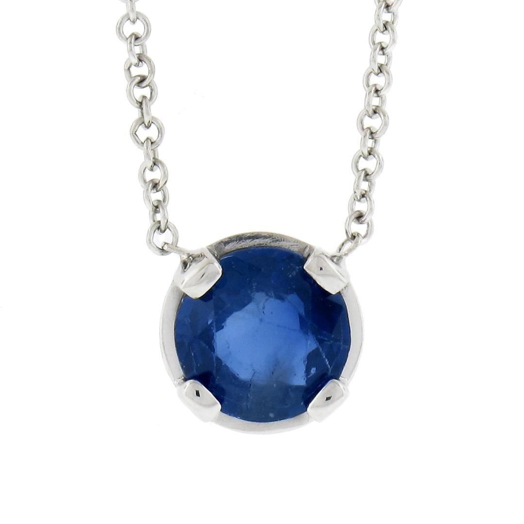 A solid 14k white gold pendant necklace, with 1 round cut natural sapphire (0.78ct). Adjustable 16 or 18 inch cable link chain, 2.03 grams total weight, pendant diameter measures 6.70mm.