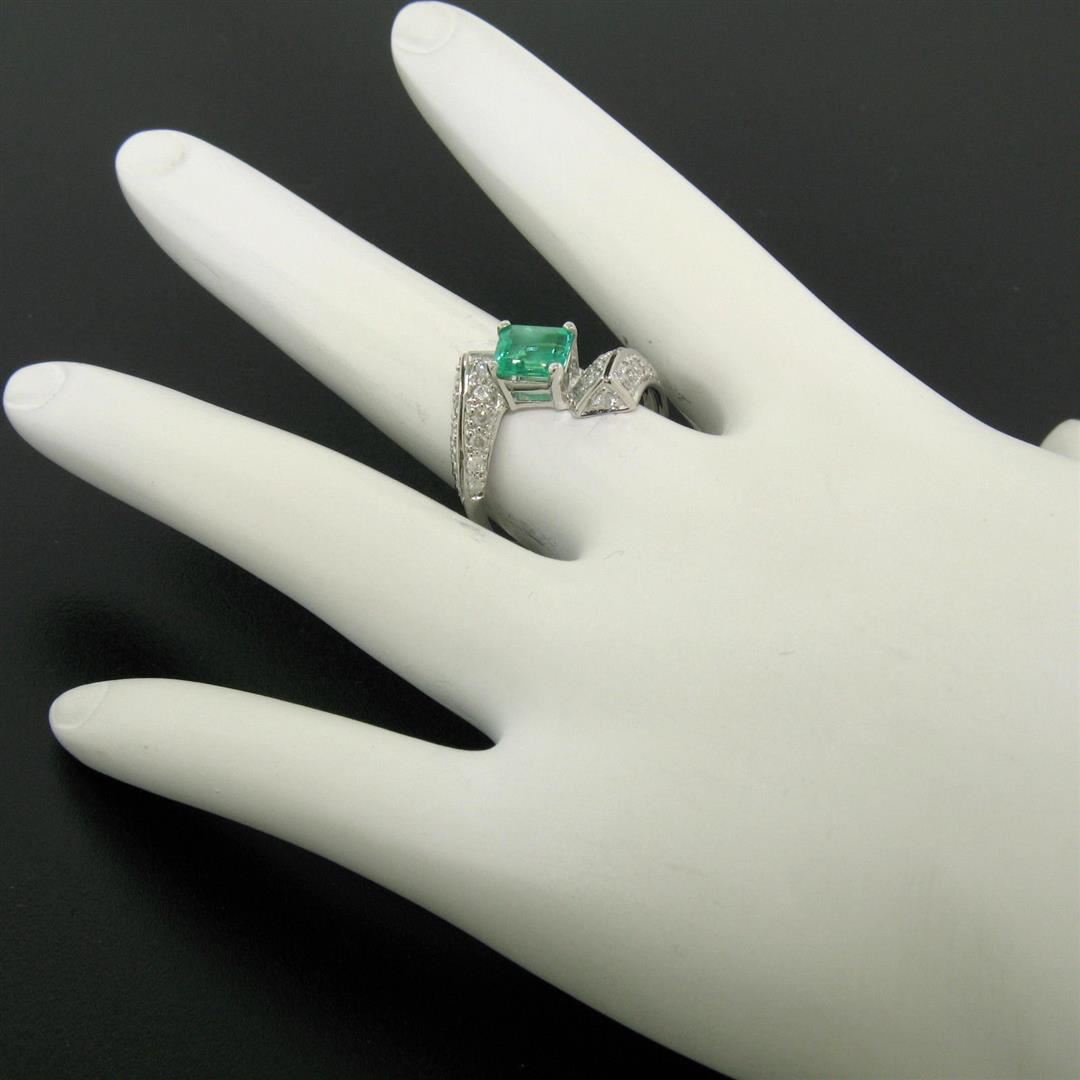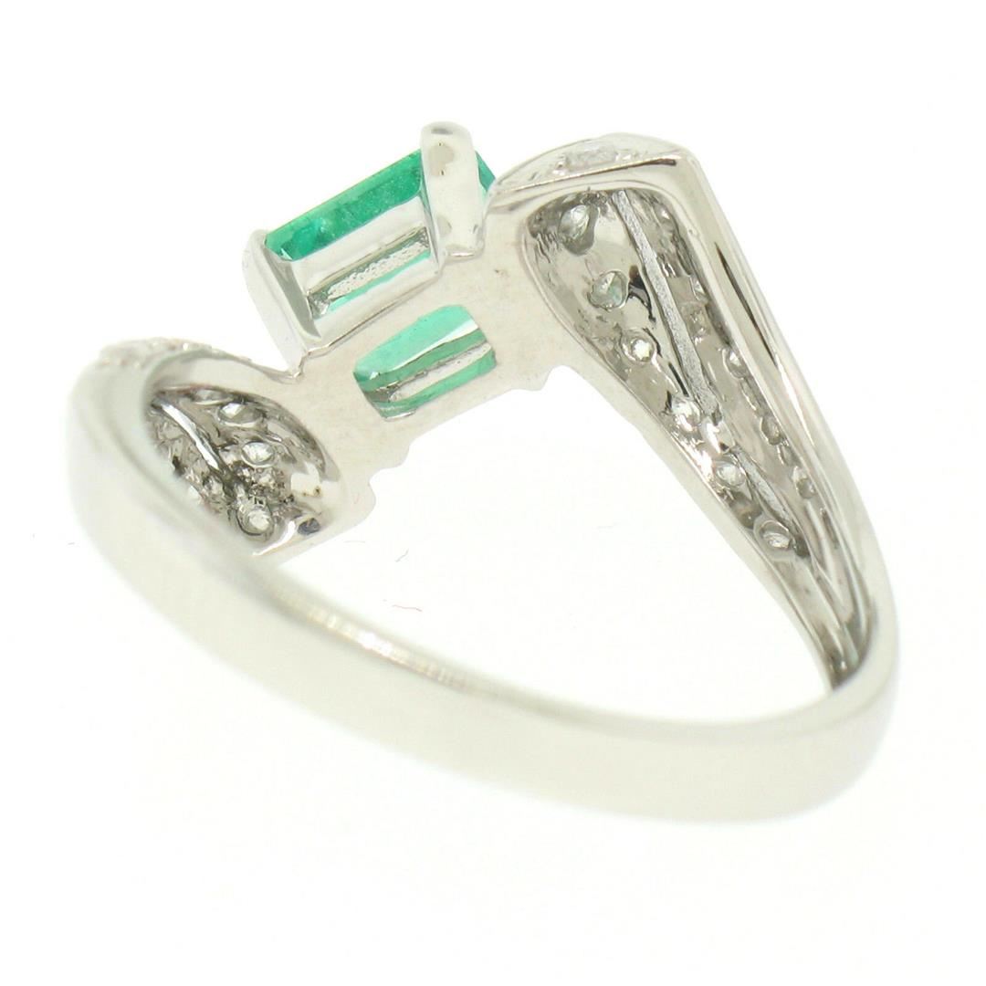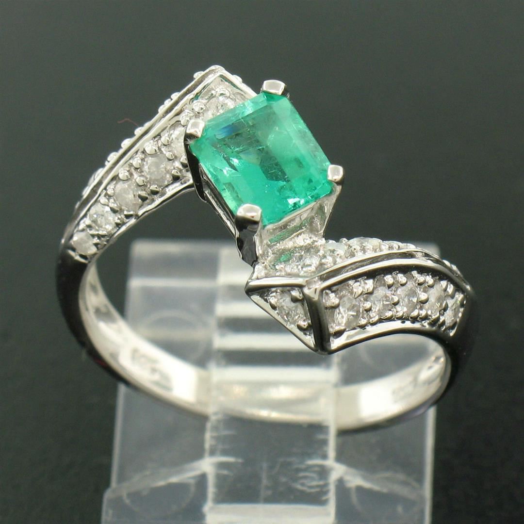 One 14k White Gold 1.20ctw Colombian Emerald & Pave Diamond Bypass Cocktail Ring. Item Details - Material: 14k Solid White Gold, Weight: 3.50 Grams, Stone(s): (1) Natural Genuine Colombian Emerald - Emerald Cut - Prong Set - Green Color - 0.80ct (approx.), (24) Natural Genuine Diamonds - Round Cut - Pave Set - G/H Color - SI2/I1 Clarity - 0.40ctw (approx.), Total Carat Weight: 1.20 (approx.), Ring Size: 7.0, Ring Width: 15mm, Ring Height: 6mm rise off the finger, Condition: Like New!