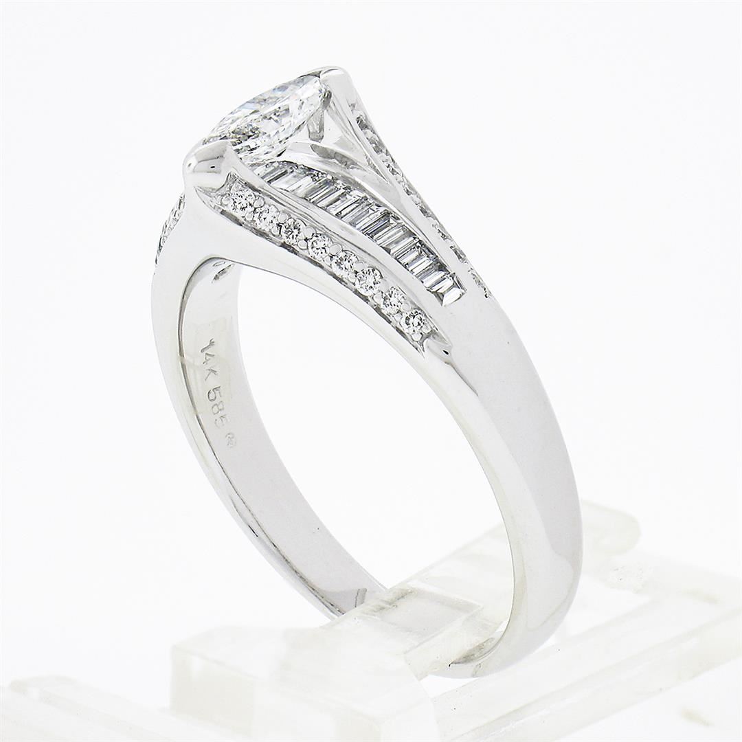 A solid 14k white gold engagement ring, with 1 marquise cut natural diamond (D - VVS1 ; 0.33ct ), and 18 baguette cut natural diamonds (E/F - VVS2/VS1 ; 0.72ctw), with 32 round brilliant cut natural diamonds (E/F - VS1 ; 0.32ctw). The ring is size 9.0, weighs a total of 6.37 grams, and measures 9.30mm wide.