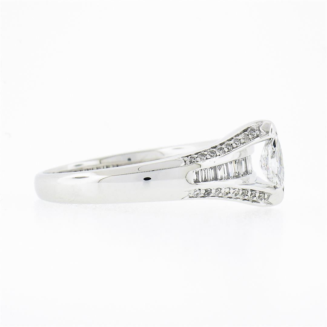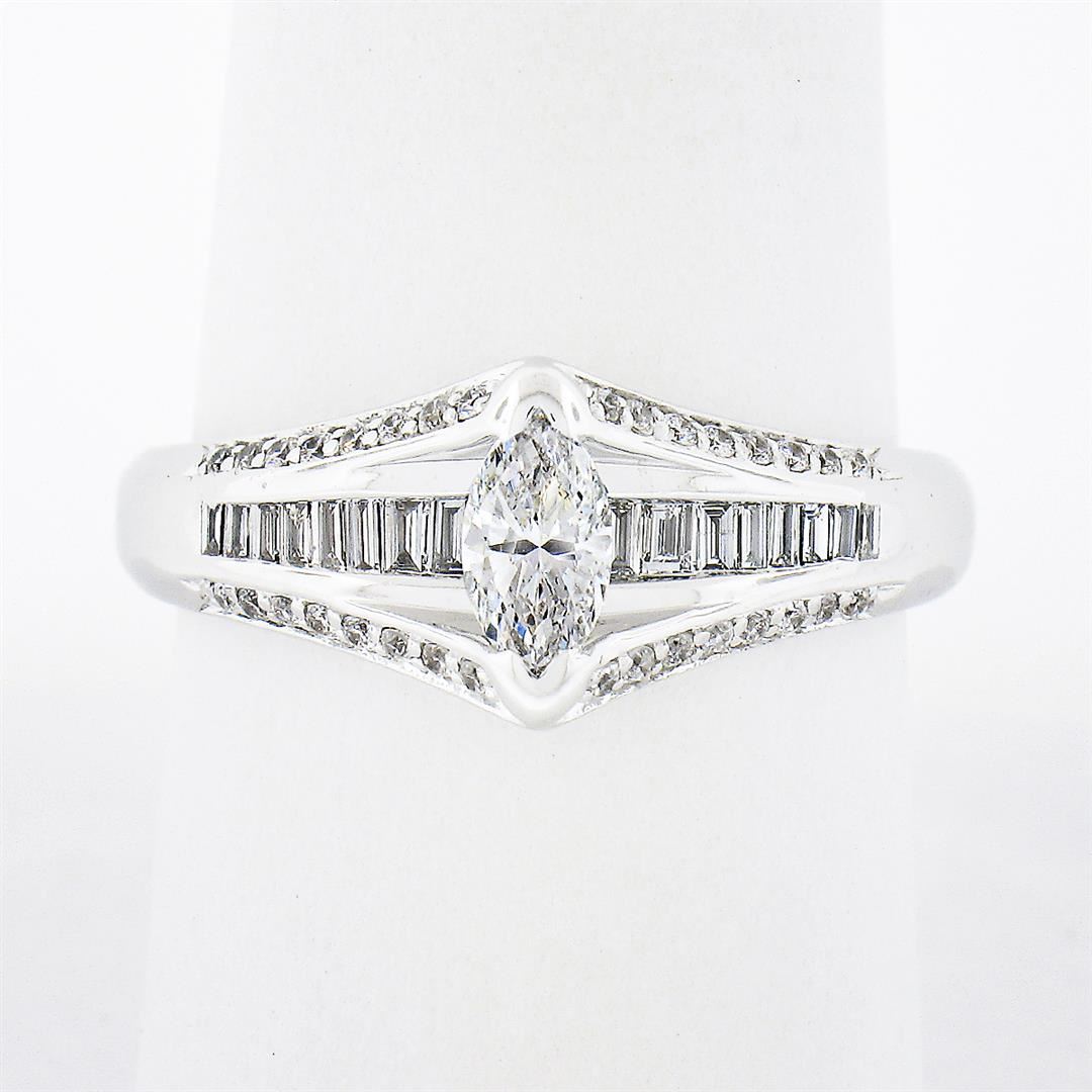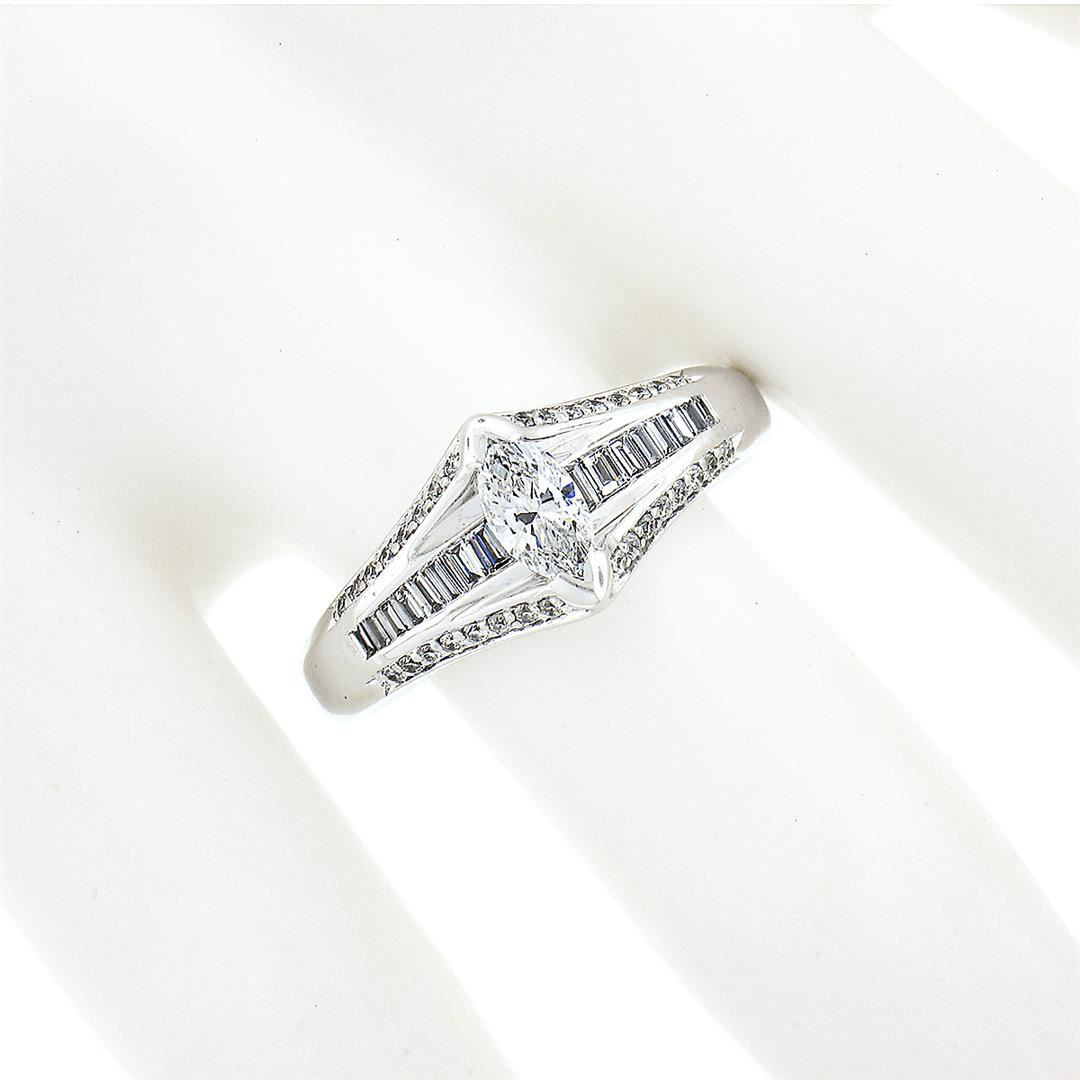 A solid 14k white gold engagement ring, with 1 marquise cut natural diamond (D - VVS1 ; 0.33ct ), and 18 baguette cut natural diamonds (E/F - VVS2/VS1 ; 0.72ctw), with 32 round brilliant cut natural diamonds (E/F - VS1 ; 0.32ctw). The ring is size 9.0, weighs a total of 6.37 grams, and measures 9.30mm wide.