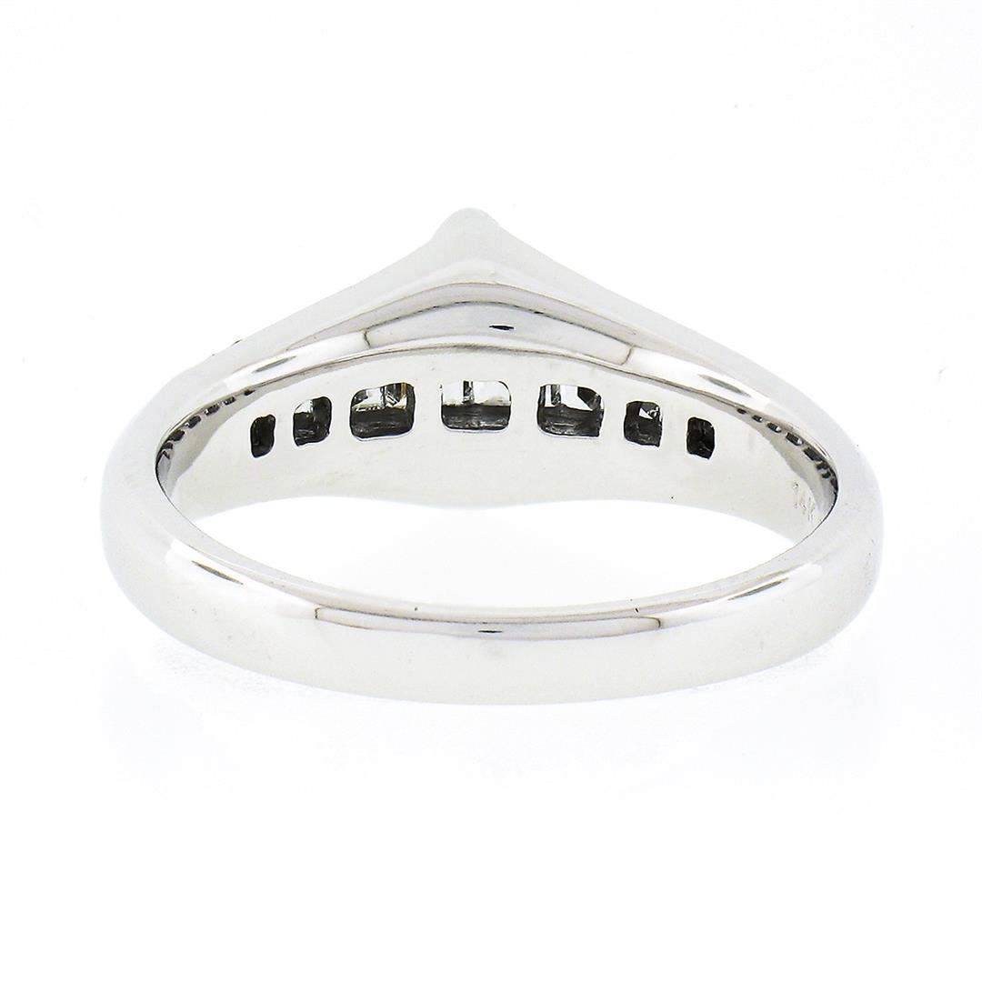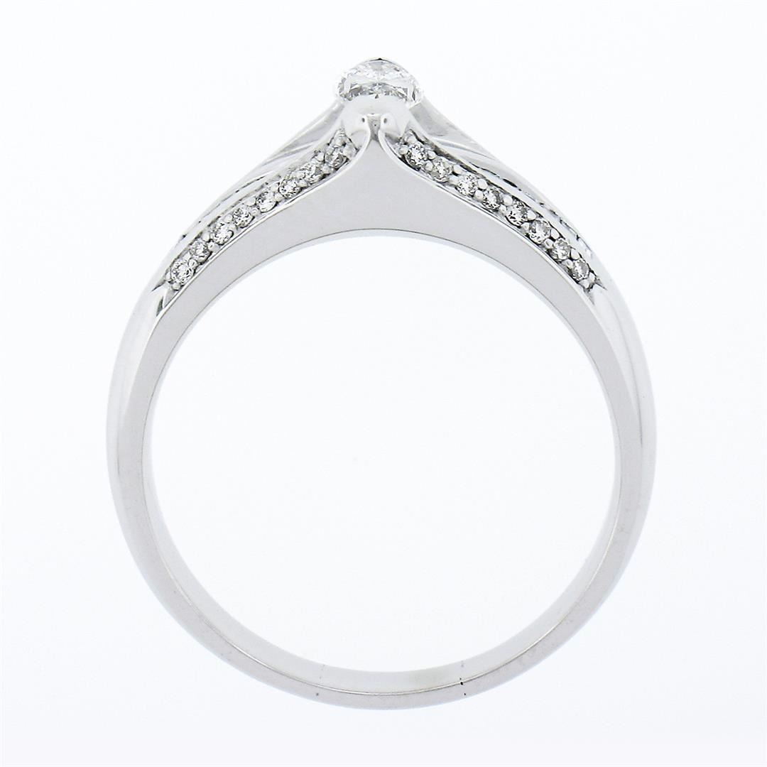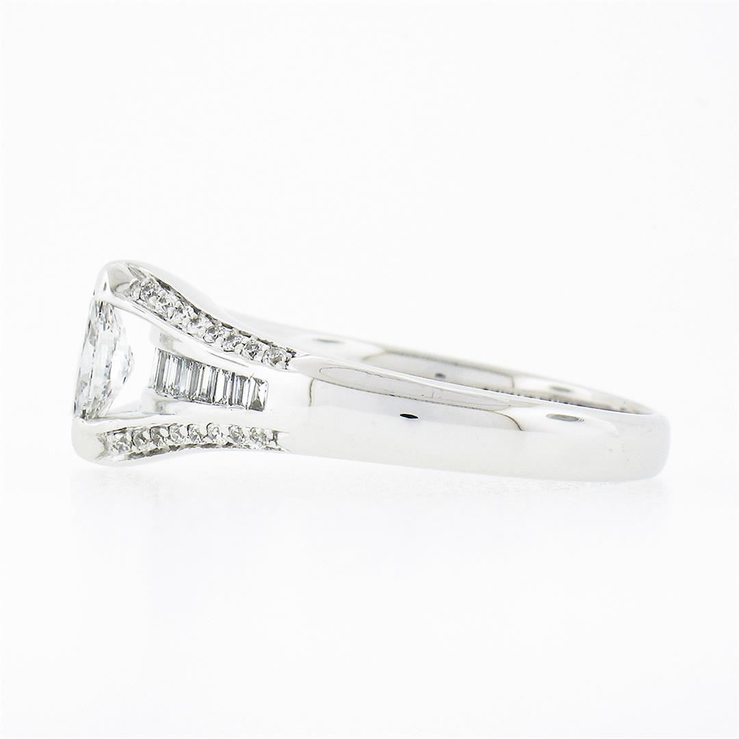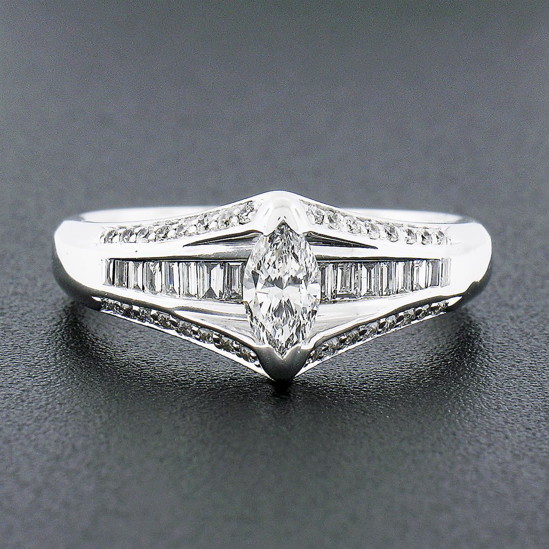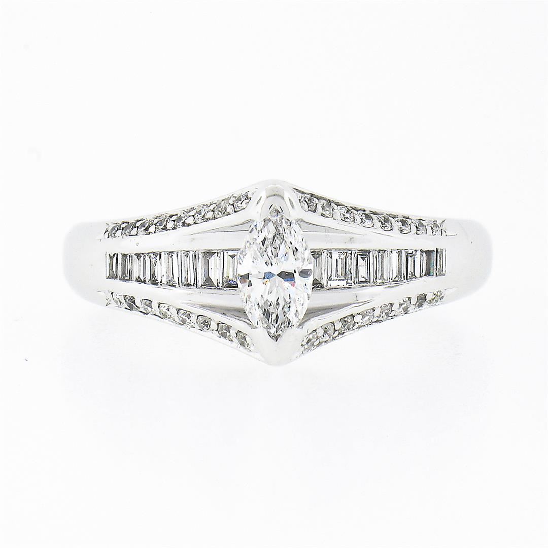 A solid 14k white gold engagement ring, with 1 marquise cut natural diamond (D - VVS1 ; 0.33ct ), and 18 baguette cut natural diamonds (E/F - VVS2/VS1 ; 0.72ctw), with 32 round brilliant cut natural diamonds (E/F - VS1 ; 0.32ctw). The ring is size 9.0, weighs a total of 6.37 grams, and measures 9.30mm wide.