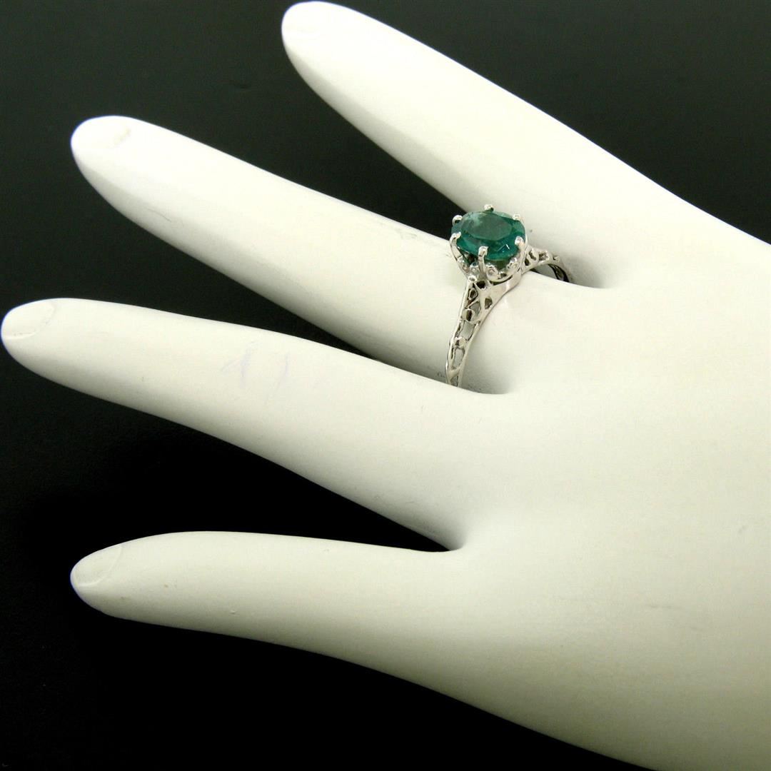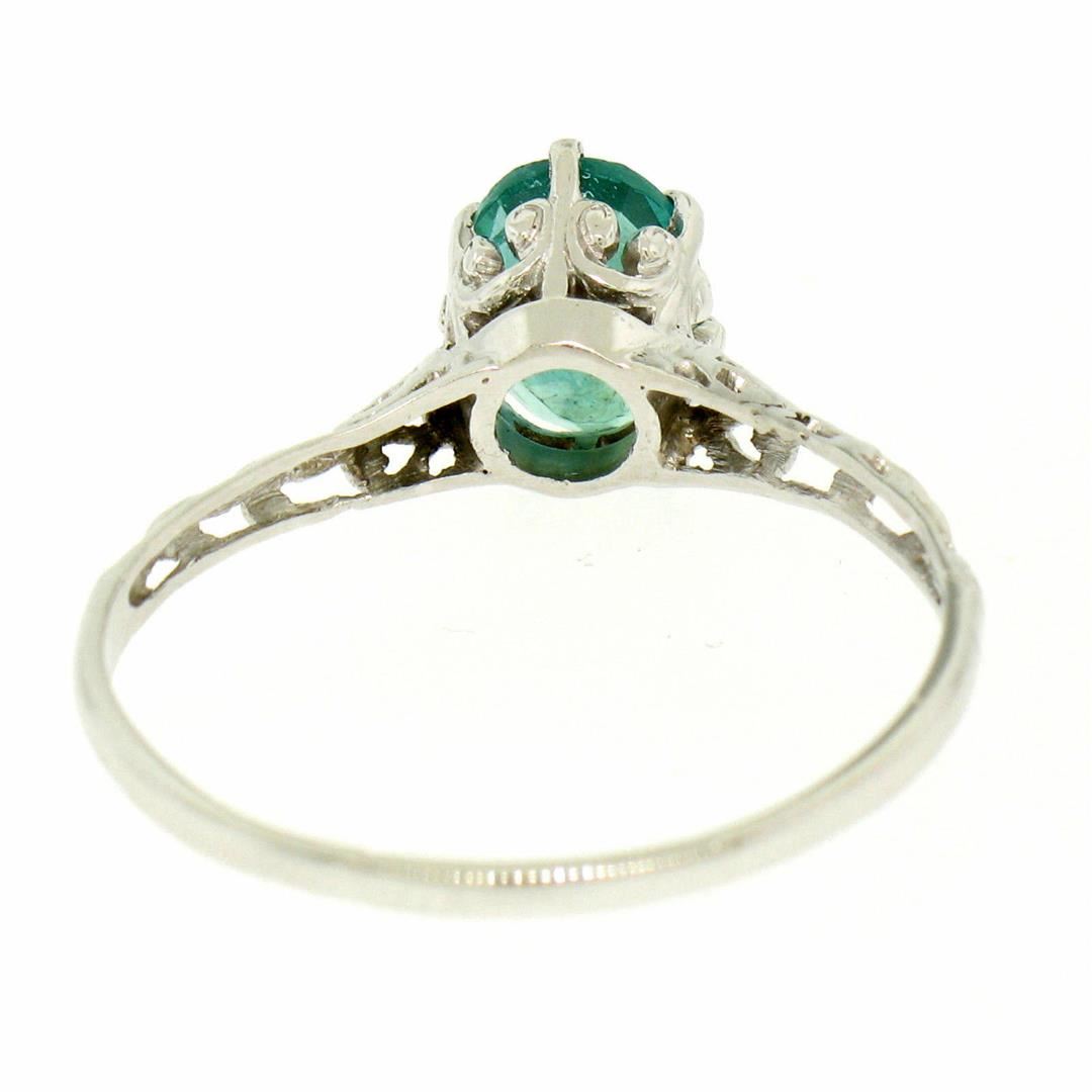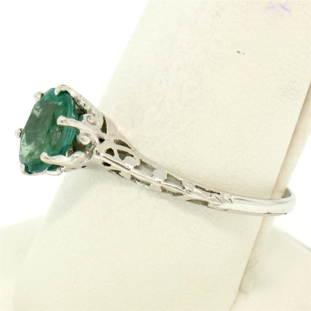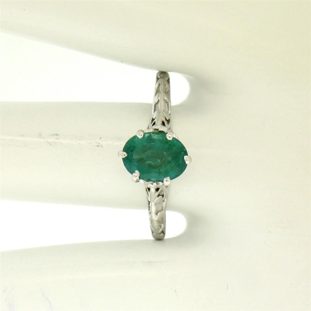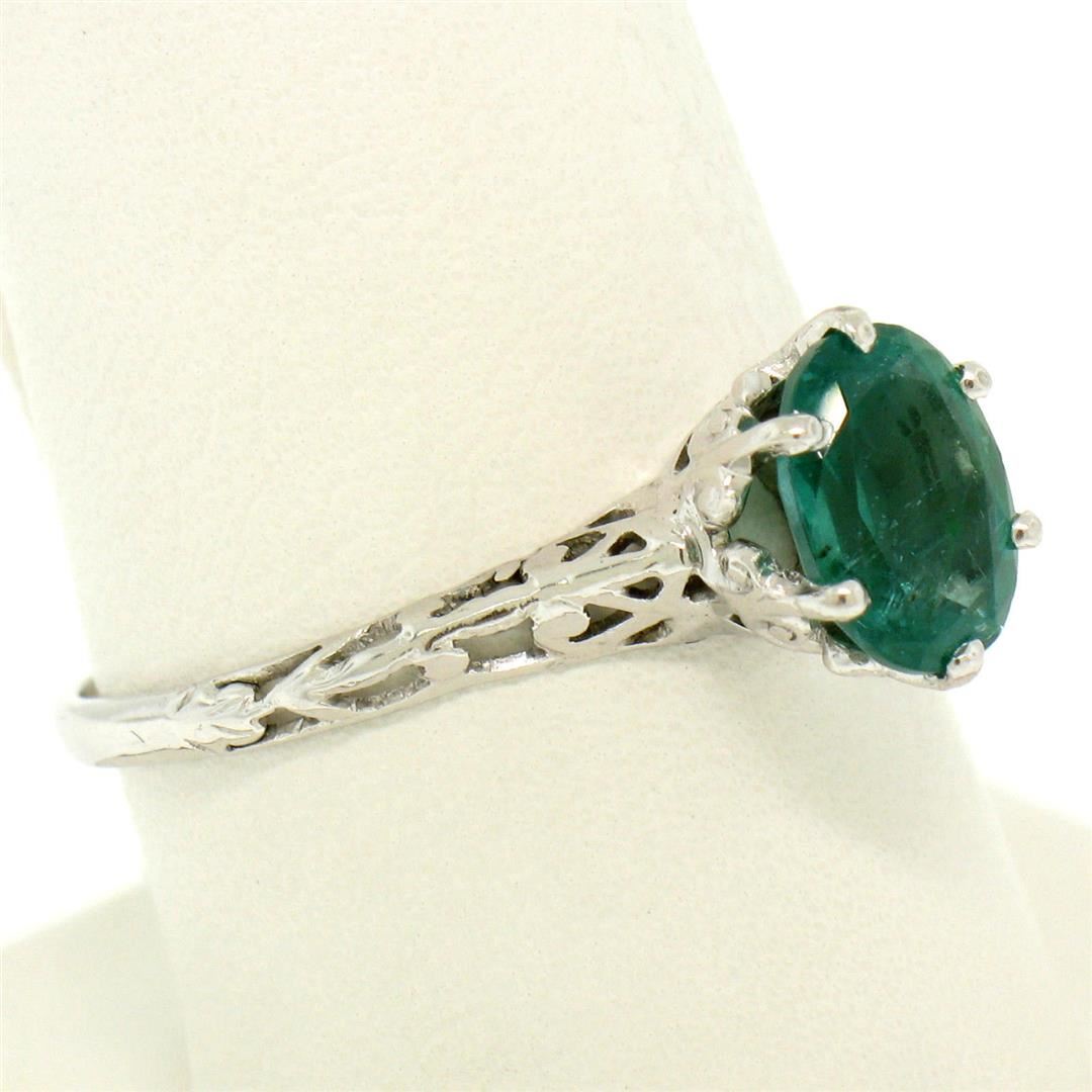 One Vintage 14k White Gold 1.38ct Prong Set Oval Cut Emerald Filigree Solitaire Ring. Item Details: Material: 14k Solid White Gold, Weight: 3.1 Grams, Stone(s): (1) Natural Genuine Emerald - Oval Cut - Prong Set - Rich Icy Green Color - 1.38ct (approx.), Total Carat Weight: 1.38 (approx.), Ring Size: 10.5 (We can custom size this ring.), Ring Width: 9.15mm, Ring Height: 7.30mm rise off the finger, Condition: Vintage estate piece. Excellent condition!