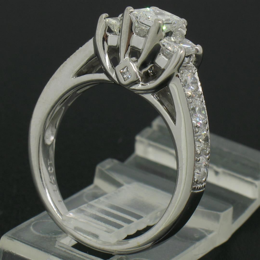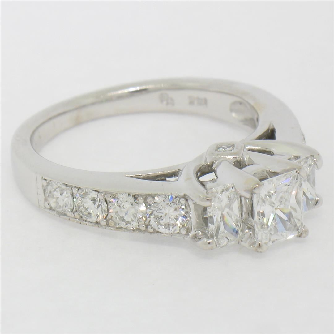 A solid 14k white gold engagement ring, with 3 radiant cut natural diamonds (F/G - VS1/VS2 ; 0.92ctw), and 8 round brilliant cut natural diamonds (F/G - VS1/VS2 ; 0.56ctw), with 2 princess cut natural diamonds (F/G - VS1/VS2 ; 0.02ctw). The ring is size 5.5, weighs a total of 4.72 grams, and measures 5.65mm wide.
