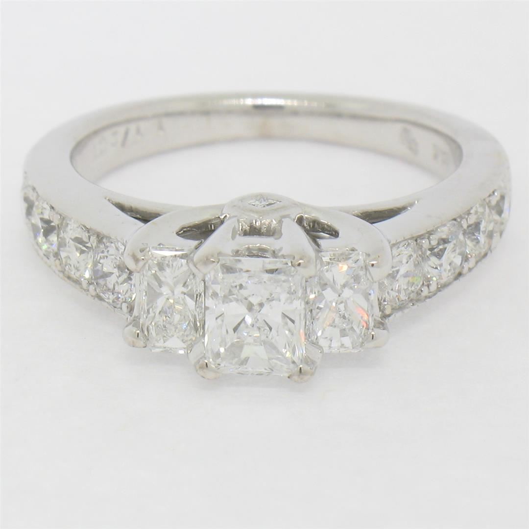 A solid 14k white gold engagement ring, with 3 radiant cut natural diamonds (F/G - VS1/VS2 ; 0.92ctw), and 8 round brilliant cut natural diamonds (F/G - VS1/VS2 ; 0.56ctw), with 2 princess cut natural diamonds (F/G - VS1/VS2 ; 0.02ctw). The ring is size 5.5, weighs a total of 4.72 grams, and measures 5.65mm wide.