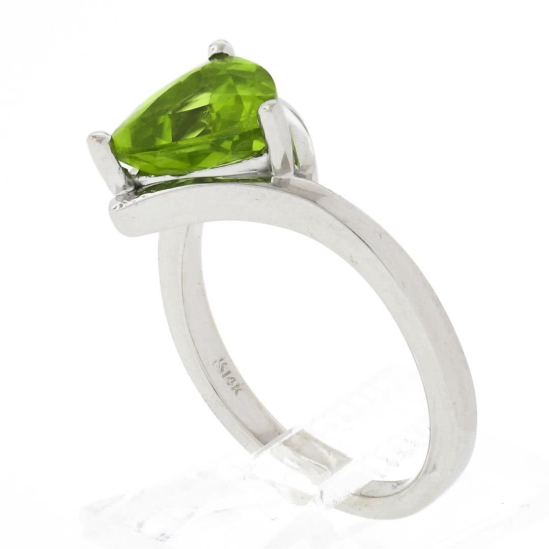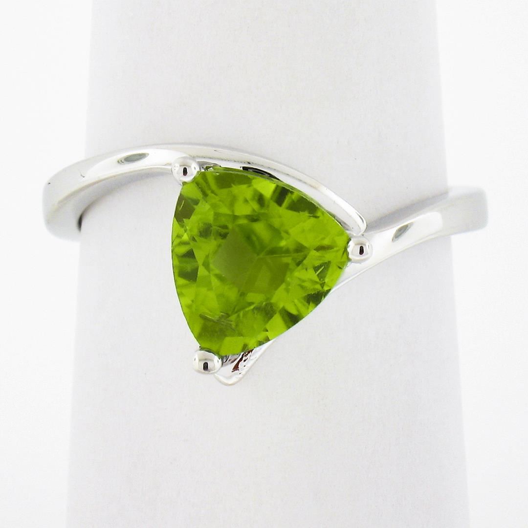 A solid 14k white gold bypass ring, with 1 trillion cut natural peridot (1.83ct ). The ring is size 7.0, weighs a total of 3.70 grams, and measures 10.70mm wide.