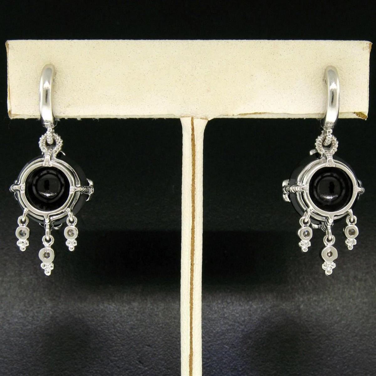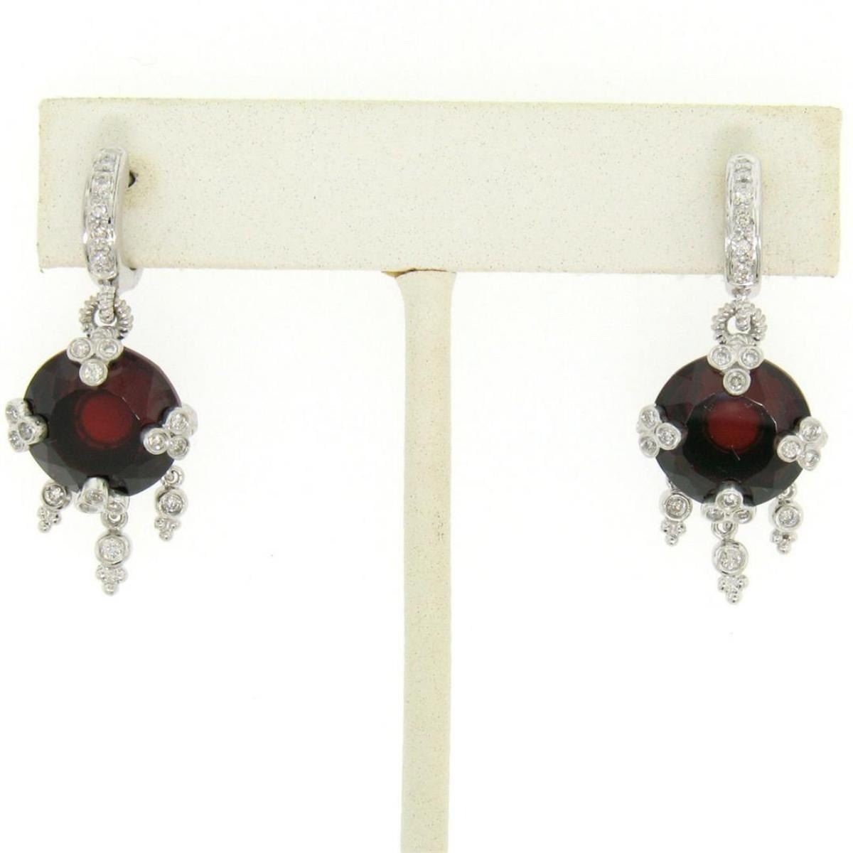 One Pair 14k White Gold 11.2ctw Round Garnet Dangle Earrings w/ Brilliant Diamond Accents. Item Details: Material: 14k Solid White Gold, Weight: 10.3 Grams, Stone(s): (2) Natural Genuine Garnets - Round Cut - Prong Set - Deep Red Color - 11.0 ctw (approx.), (40) Natural Genuine Diamonds - Round Brilliant Cut - Bezel & Prong Set - VS2 Clarity - H Color - 0.20 ctw (approx.), Total Carat Weight: 11.20 (approx.), Backing: Snap Closures (Pierced ears required), Width: 15.2mm, Overall Height: 36.9mm. Overall Thickness: 9.10mm. Dangle Length: 25.65mm. Condition: Amazing - Like New!