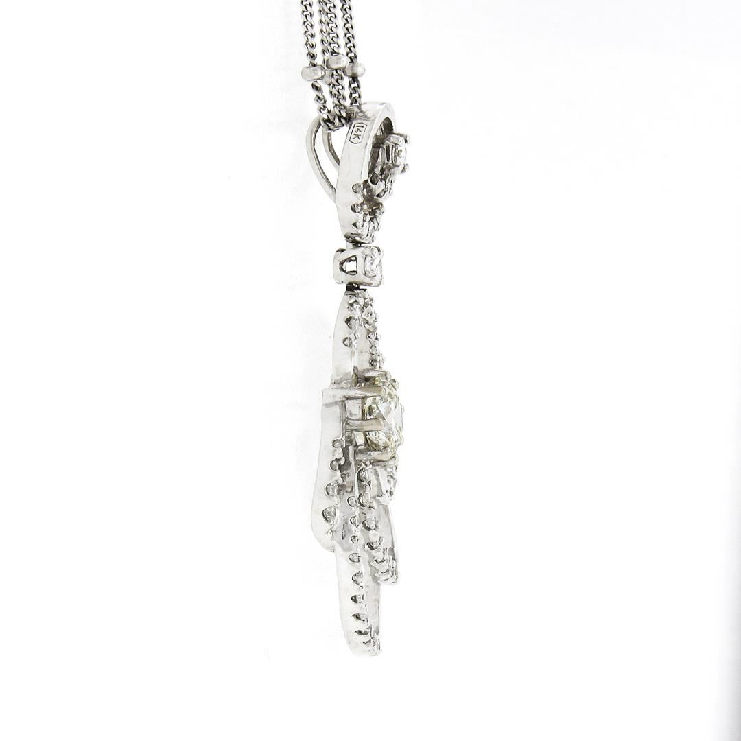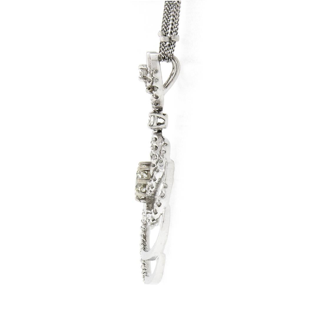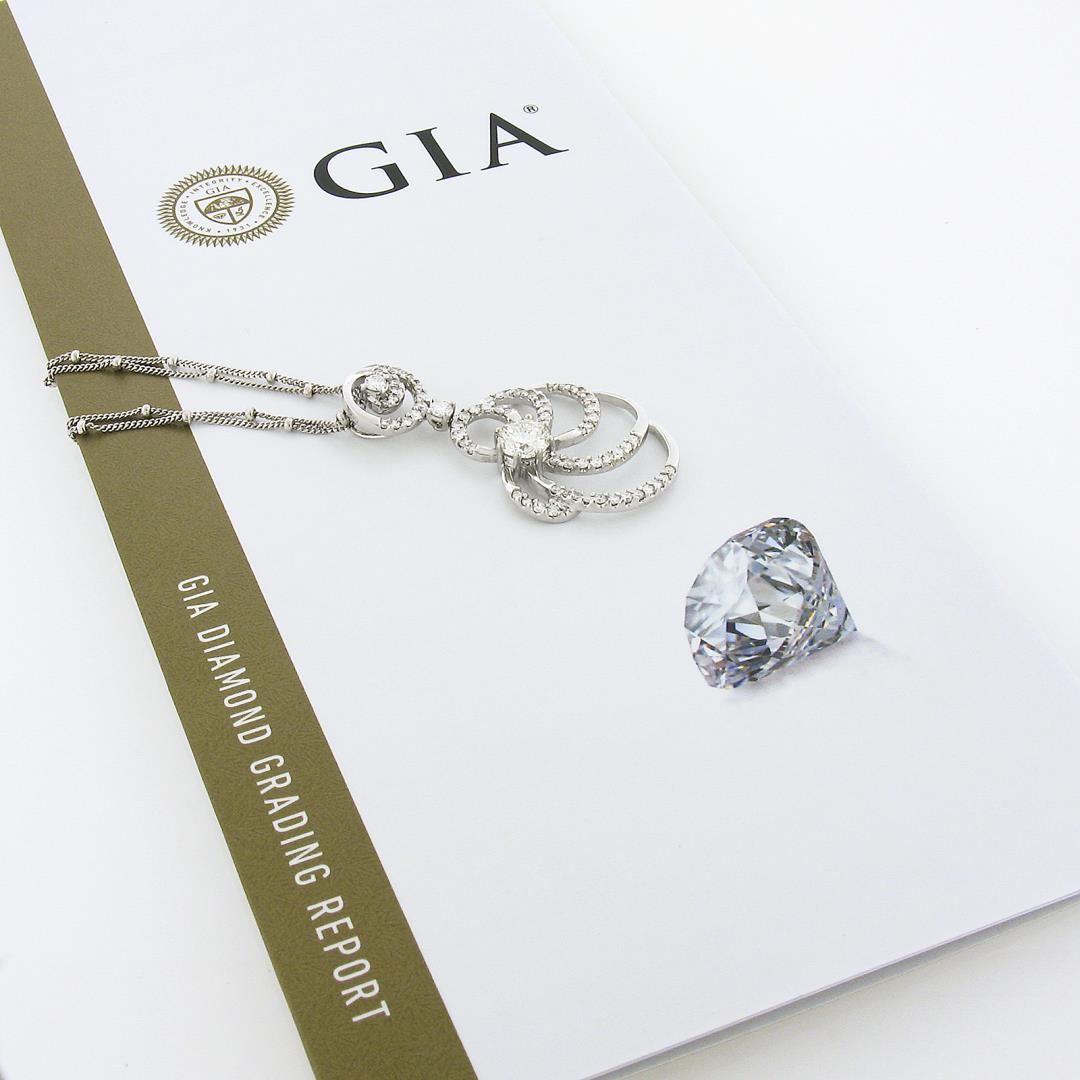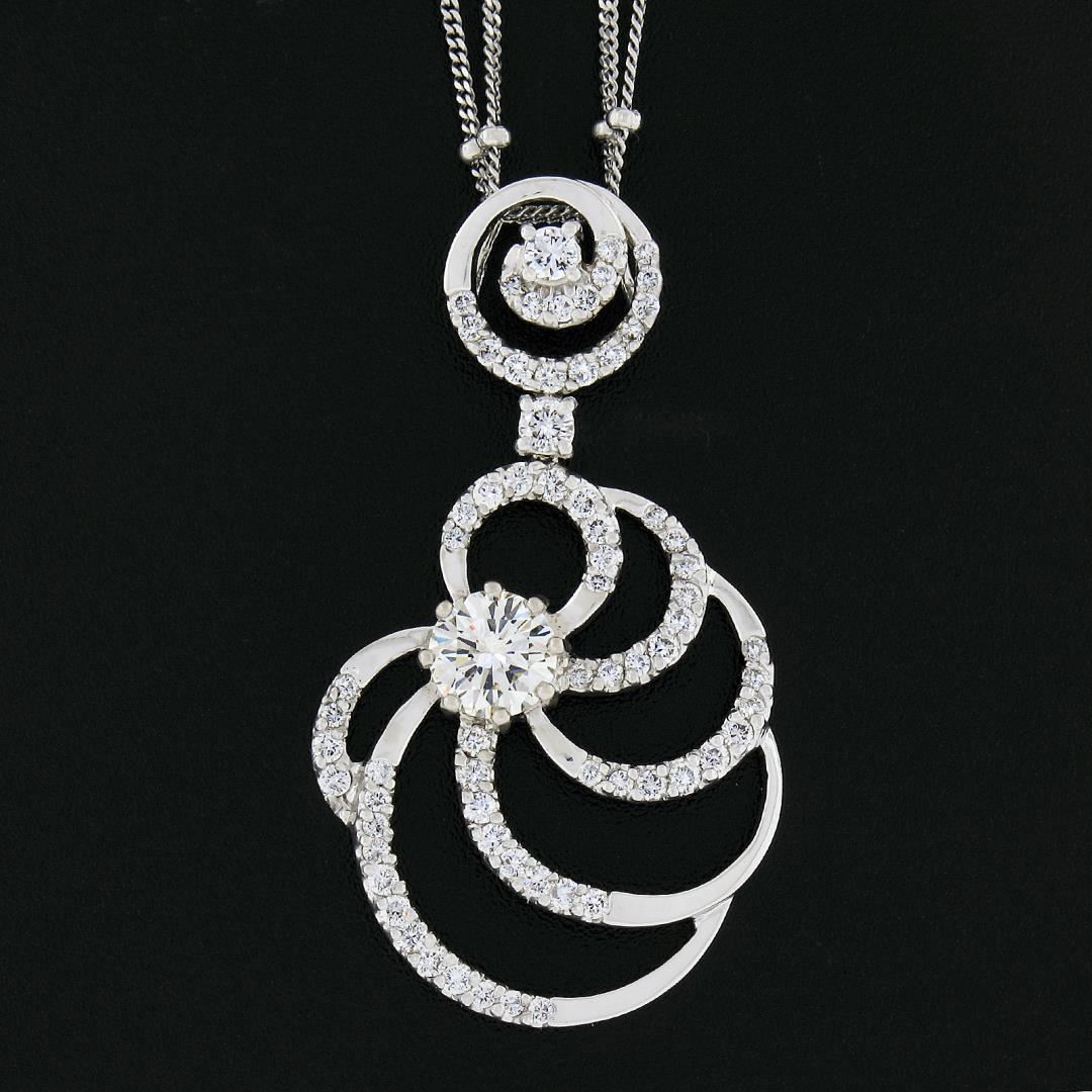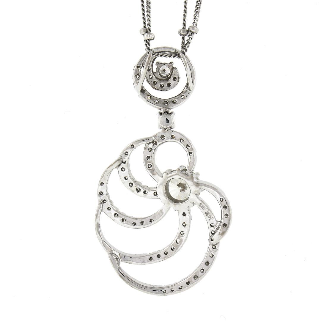 A solid 14k white gold swirl pendant necklace, with 1 GIA graded round brilliant cut natural diamond (N - SI2 ; 1.06ct), and 70 round brilliant cut natural diamonds (H/I - VS2/SI1 ; 1.0ctw ). 17 inch dual bead chain w/ curb link chain, 10.70 grams total weight, pendant measures 42.80x23.50mm. Comes with all original relevant certifications.