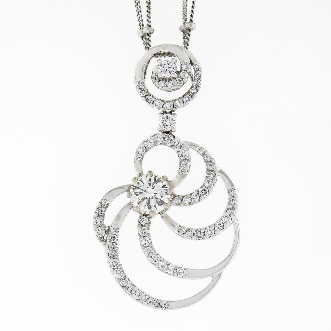 A solid 14k white gold swirl pendant necklace, with 1 GIA graded round brilliant cut natural diamond (N - SI2 ; 1.06ct), and 70 round brilliant cut natural diamonds (H/I - VS2/SI1 ; 1.0ctw ). 17 inch dual bead chain w/ curb link chain, 10.70 grams total weight, pendant measures 42.80x23.50mm. Comes with all original relevant certifications.