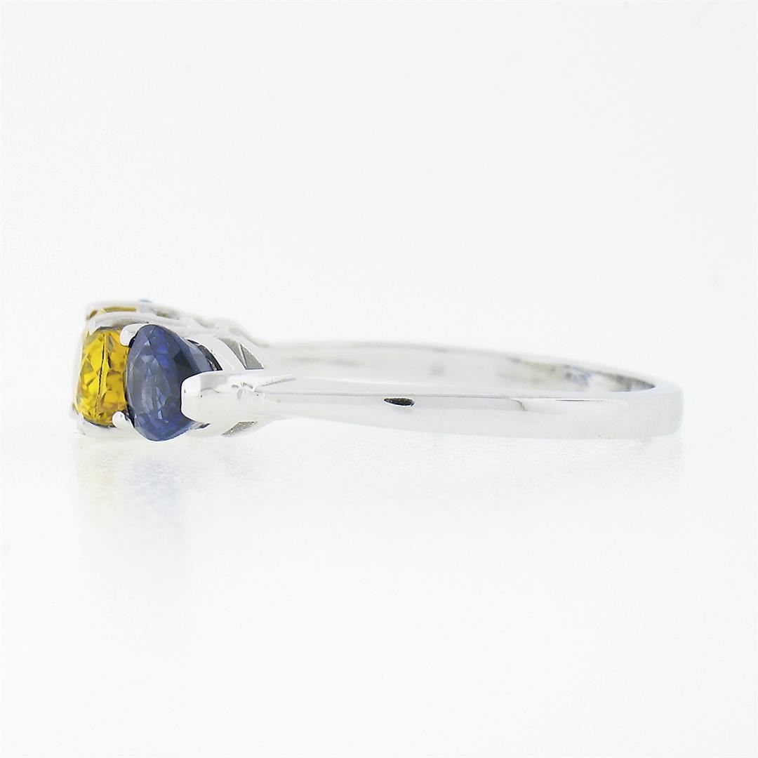 A solid 14k white gold 3 stones ring, featuring 1 oval brilliant cut natural yellow sapphire (1.00ct ), and 2 pear cut natural blue sapphires (1.25ctw). The ring is size 7.0, weighs a total of 2.87 grams, and measures 5.1mm wide.